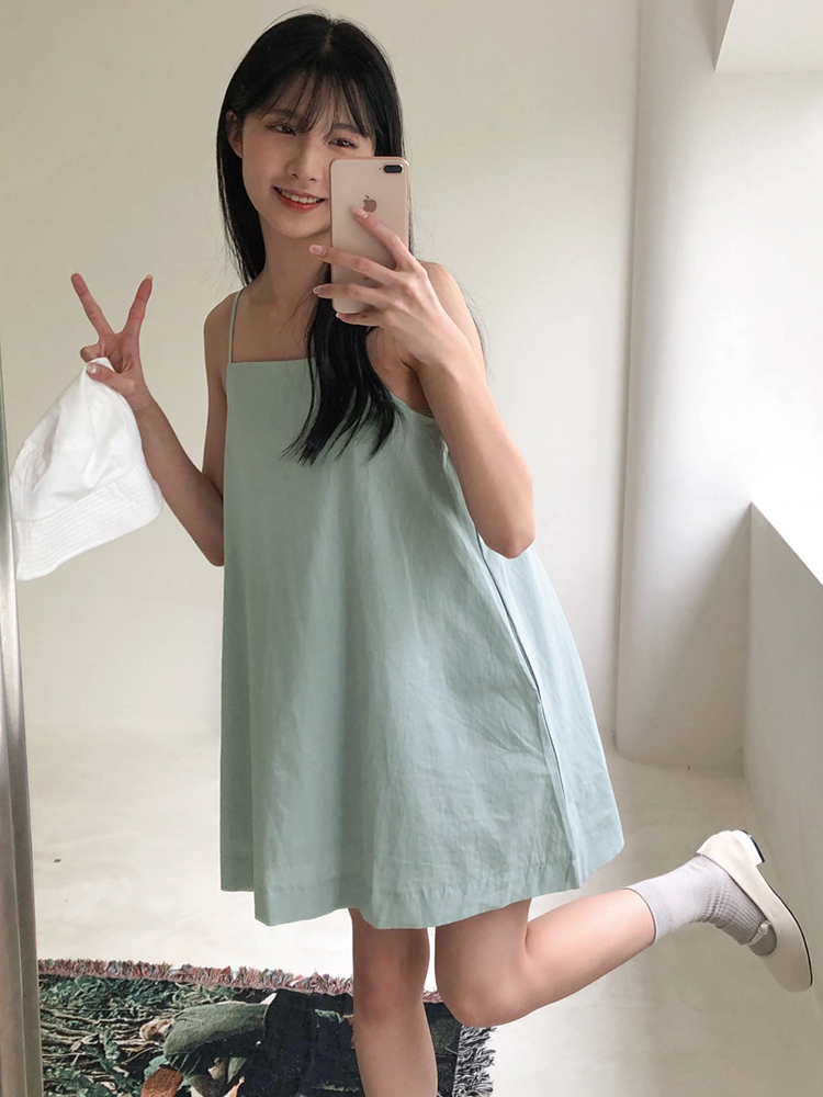 日系棉麻吊带裙A字裙子夏女韩版露背一字领连衣裙小个子苎麻短裙