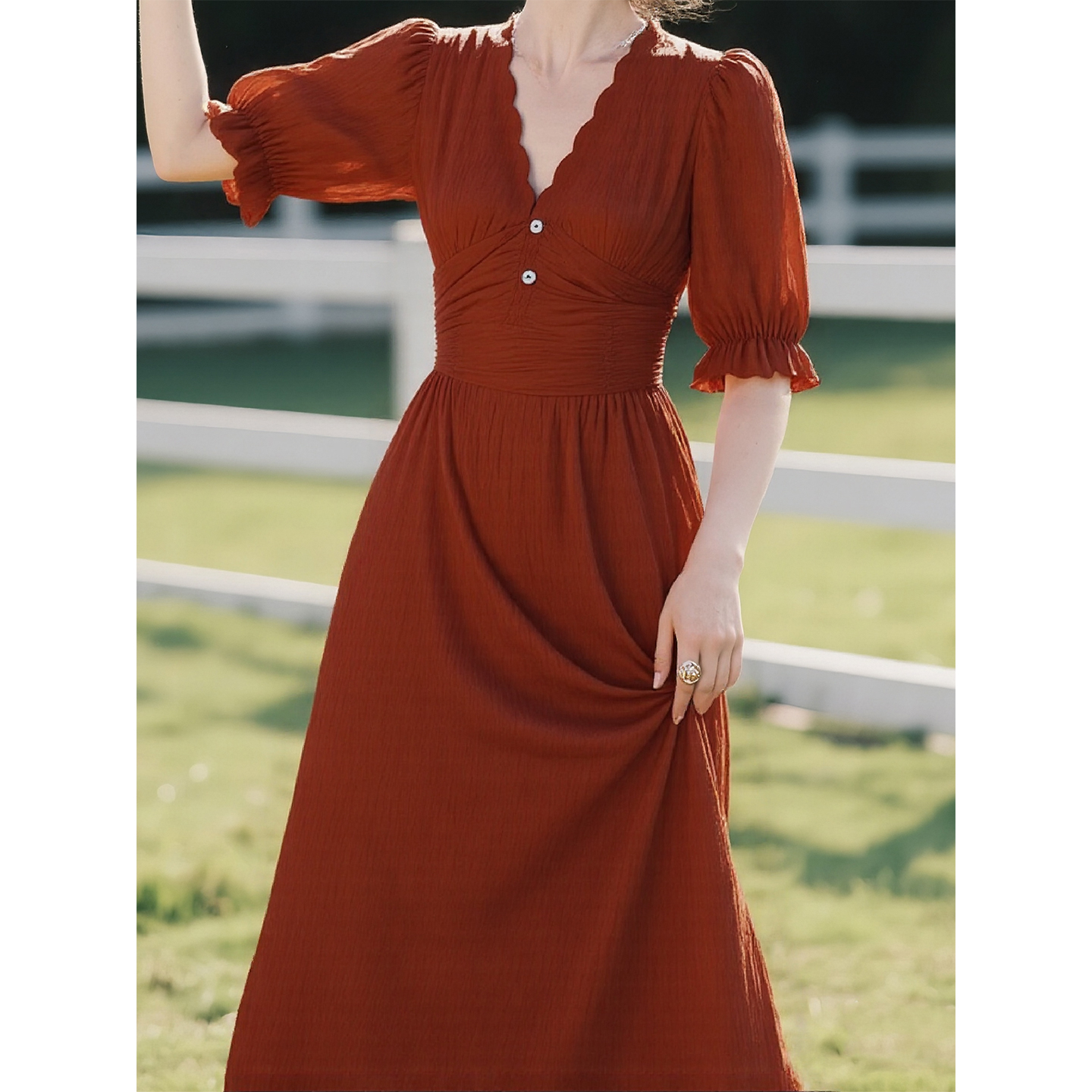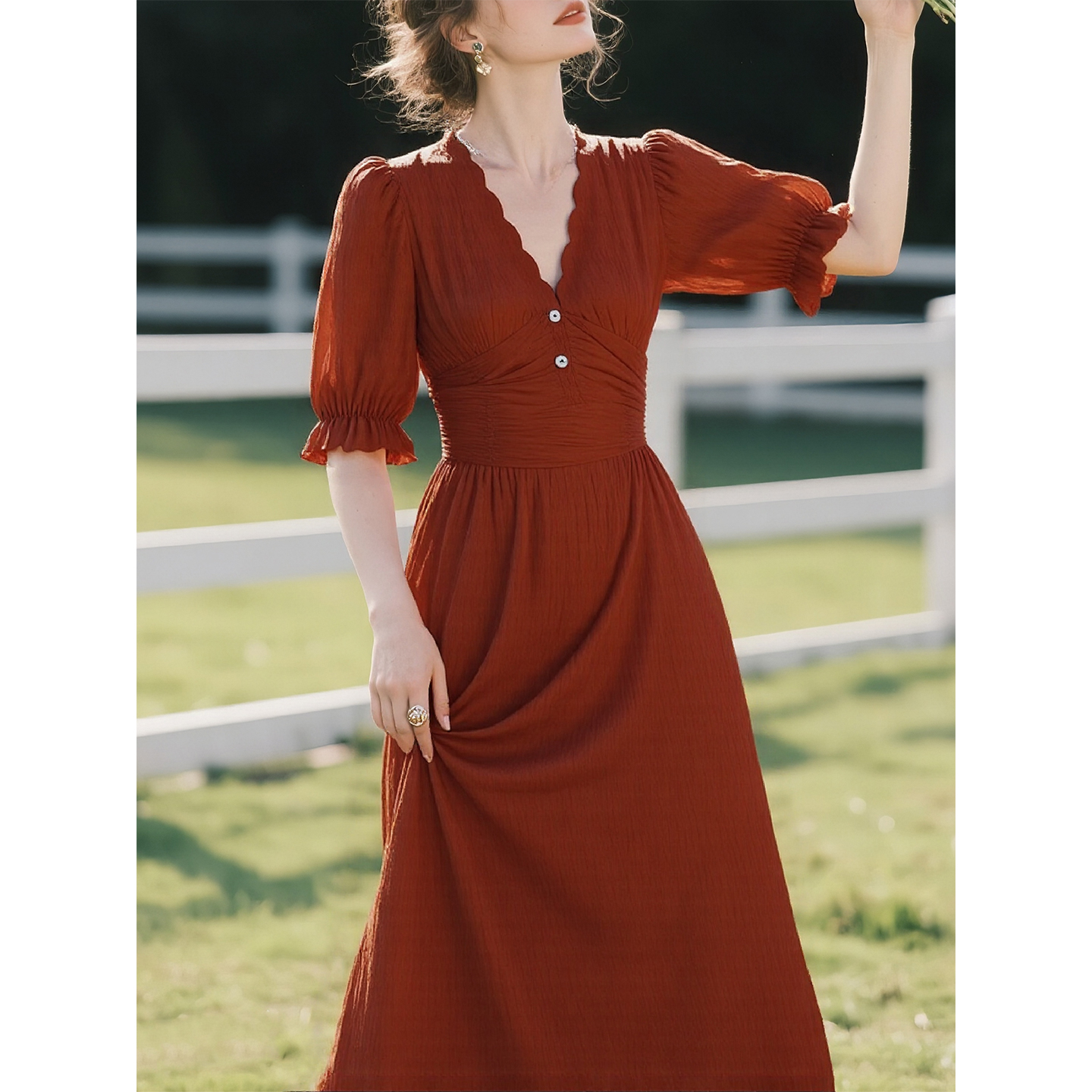 红色亚麻V领短袖连衣裙女2025年夏季新款法式收腰显瘦泡泡袖裙子