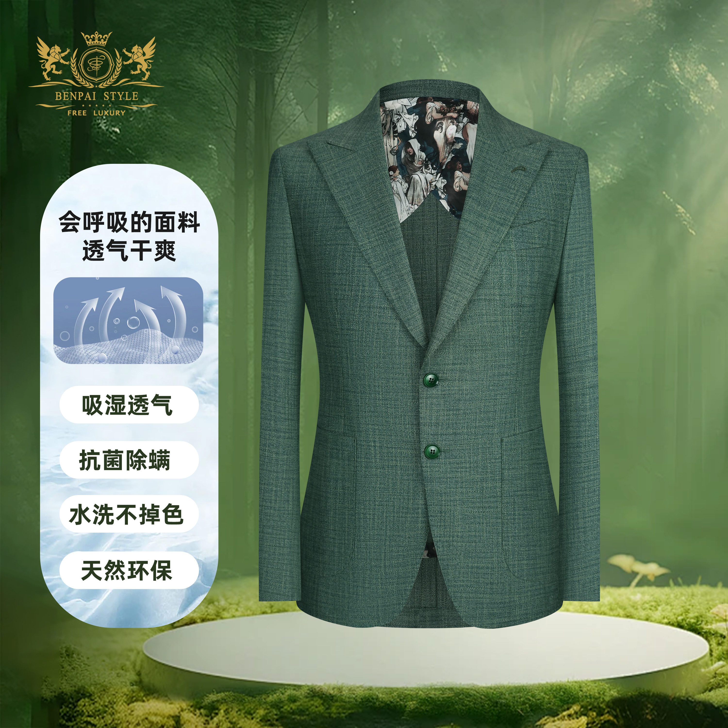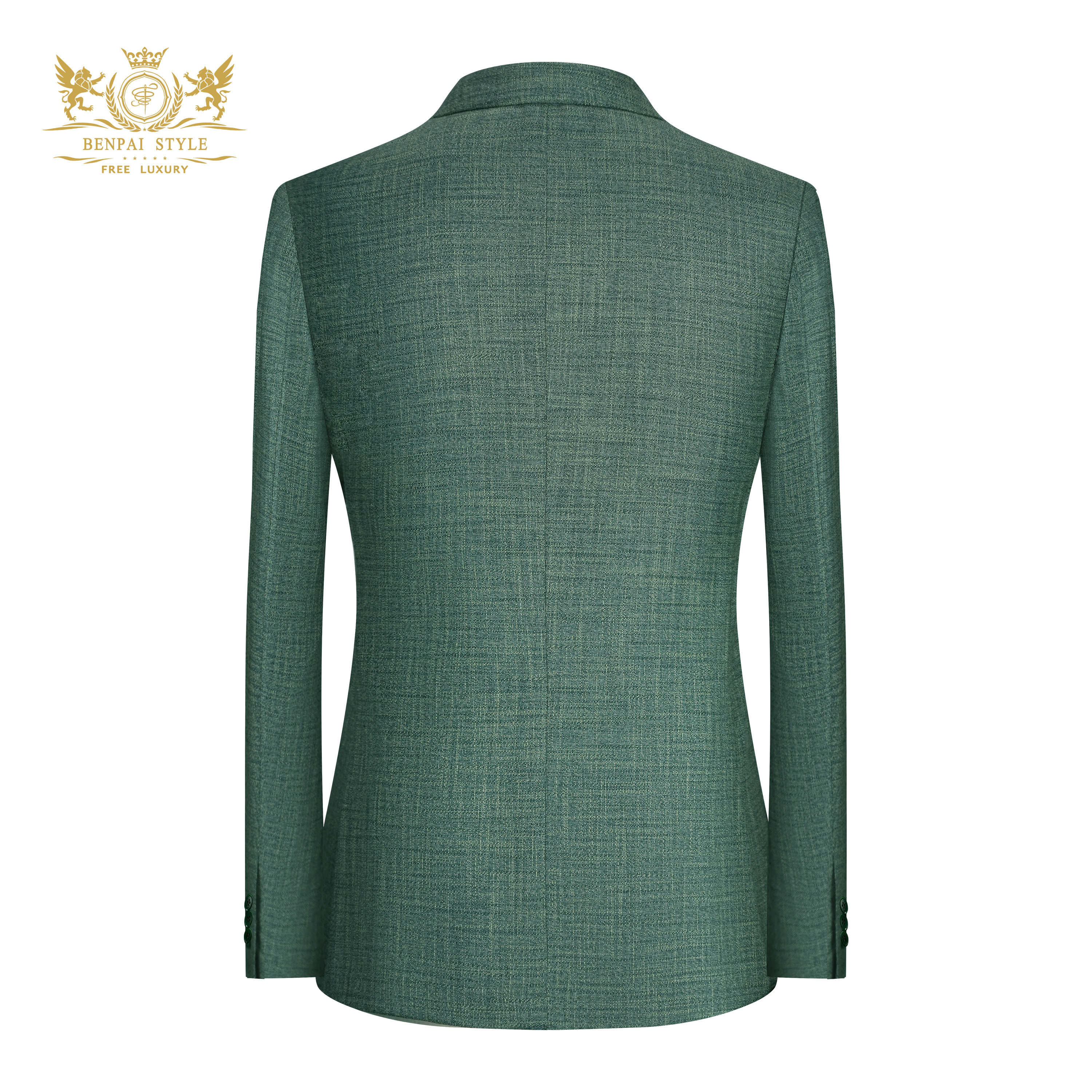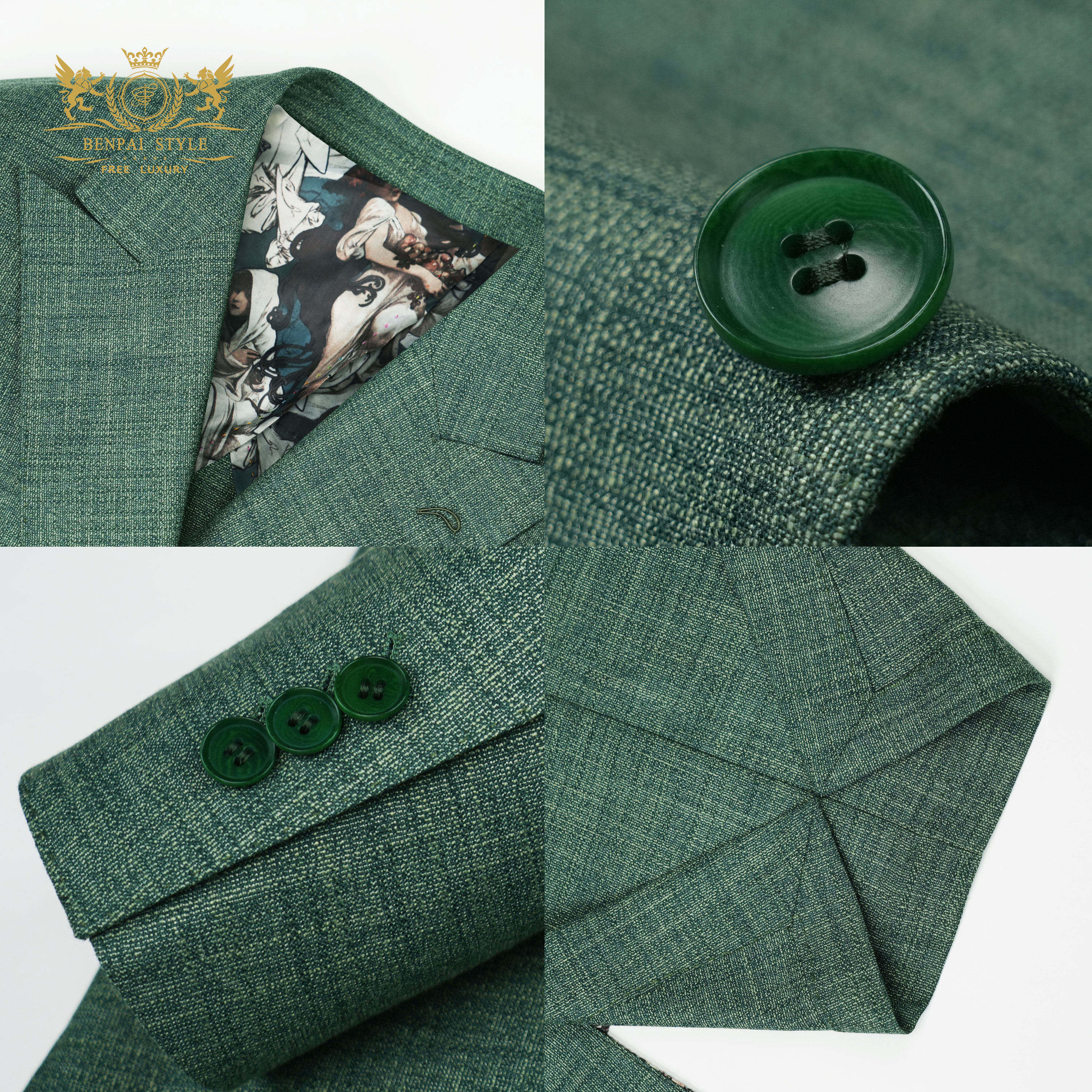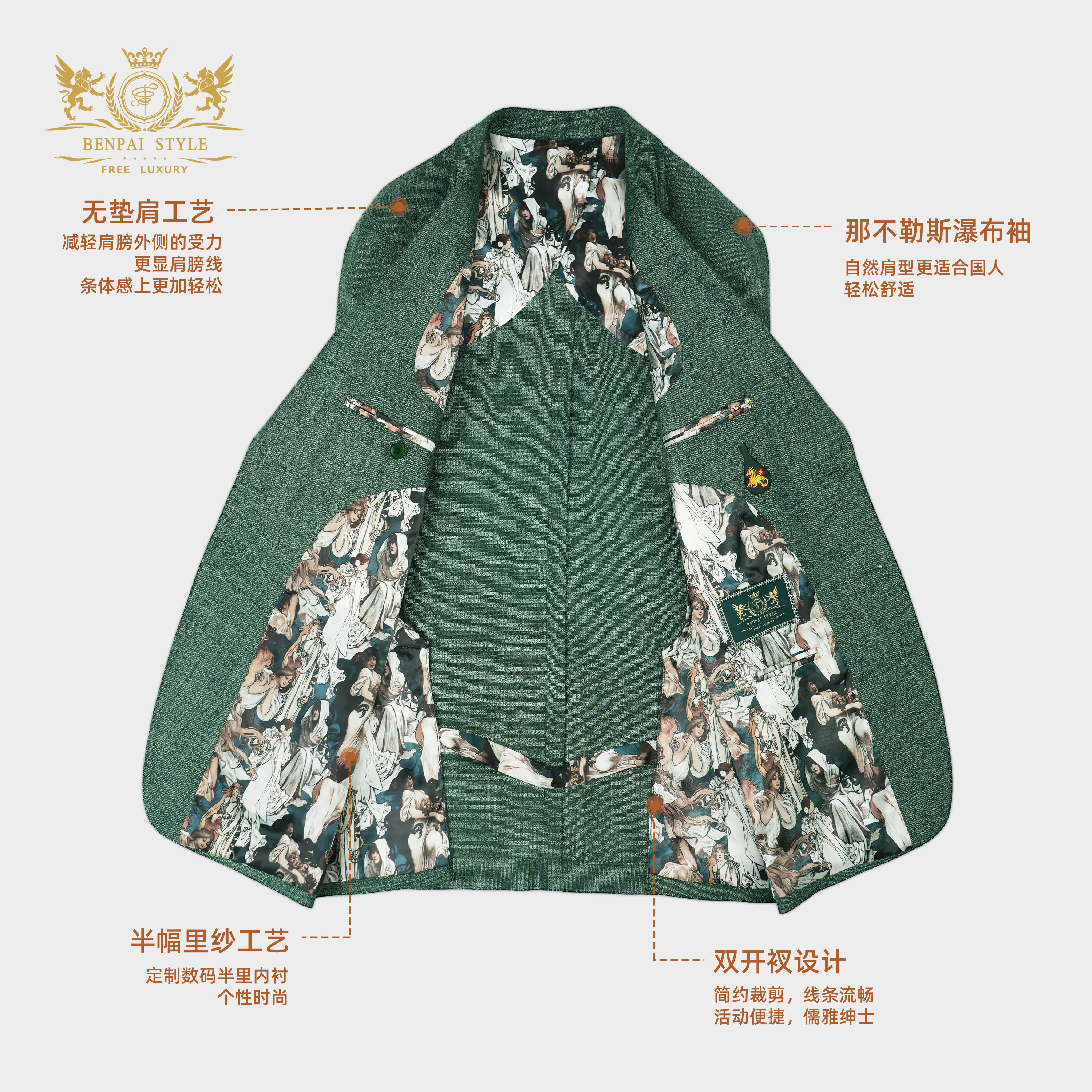 本派高定半麻衬西装男高级舒适透气绿色那不勒斯半里休闲西服套装