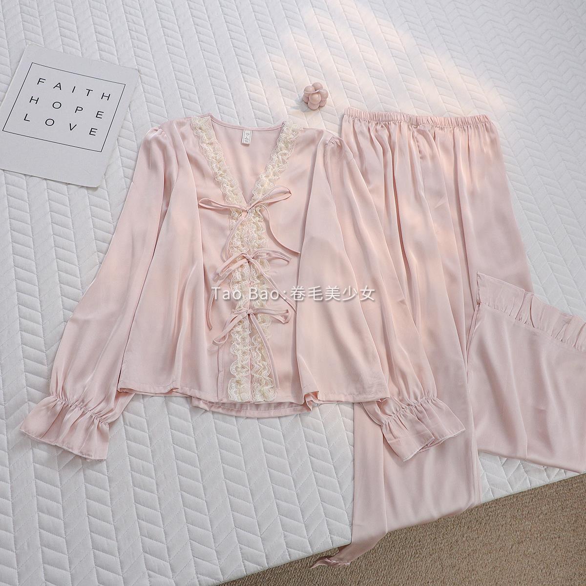 柔美豆沙粉气质蝴蝶结春秋季冰丝长袖睡衣女高级感性感套装家居服