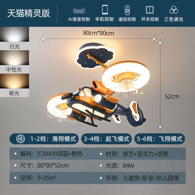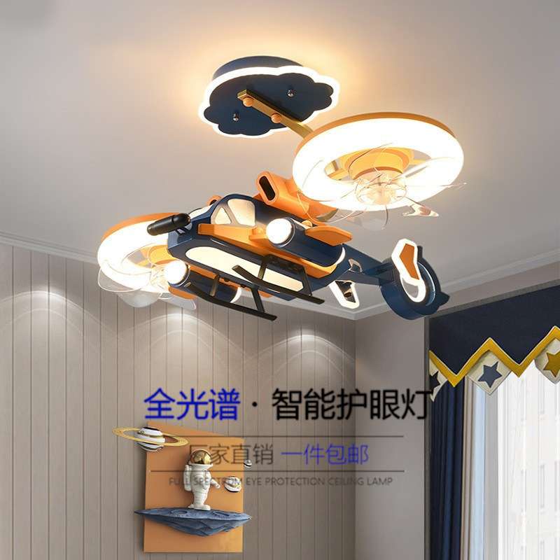 儿童房风扇灯男孩卧室灯网红创意飞机模型橙色战斗机全光谱风扇灯