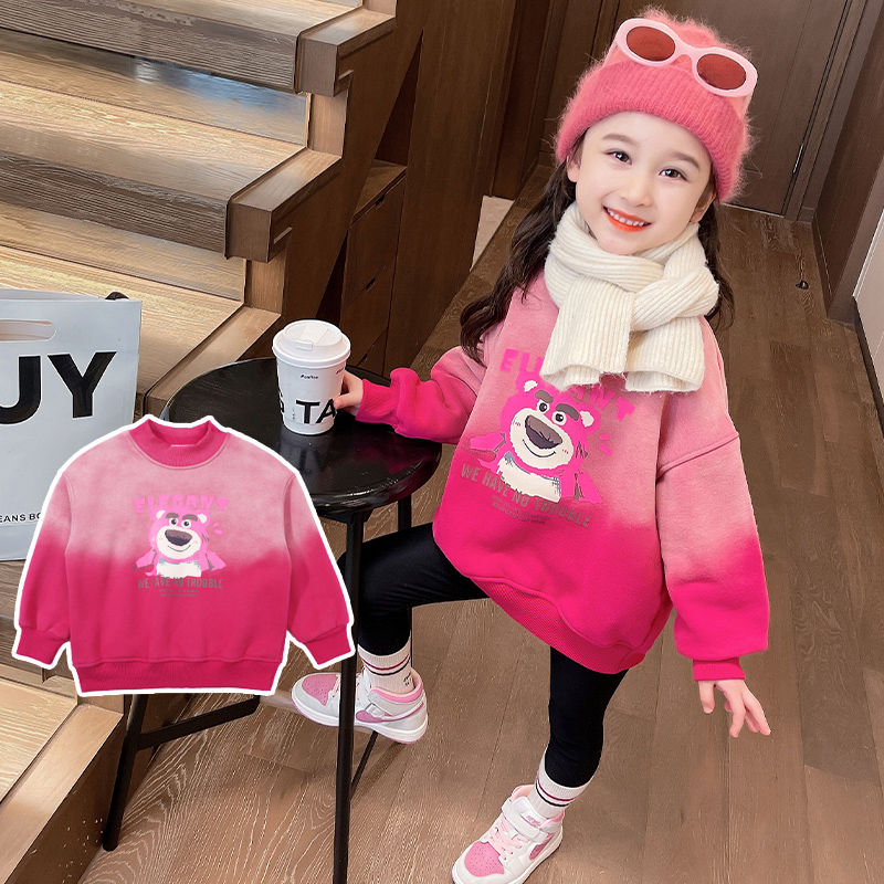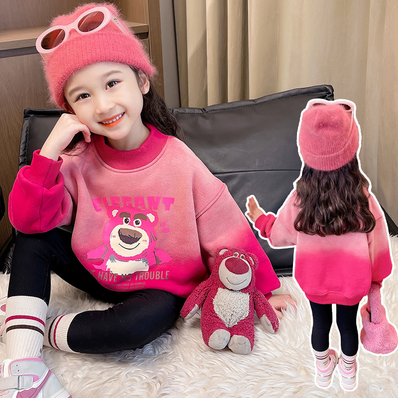 小黄鸭女童2025秋冬新款加绒卫衣儿童渐变草莓熊加厚宝宝洋气上衣
