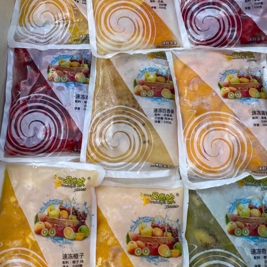 速冻冷冻现榨新鲜糖渍草莓百香果芒果黄桃橙子猕猴桃果汁500g出1L