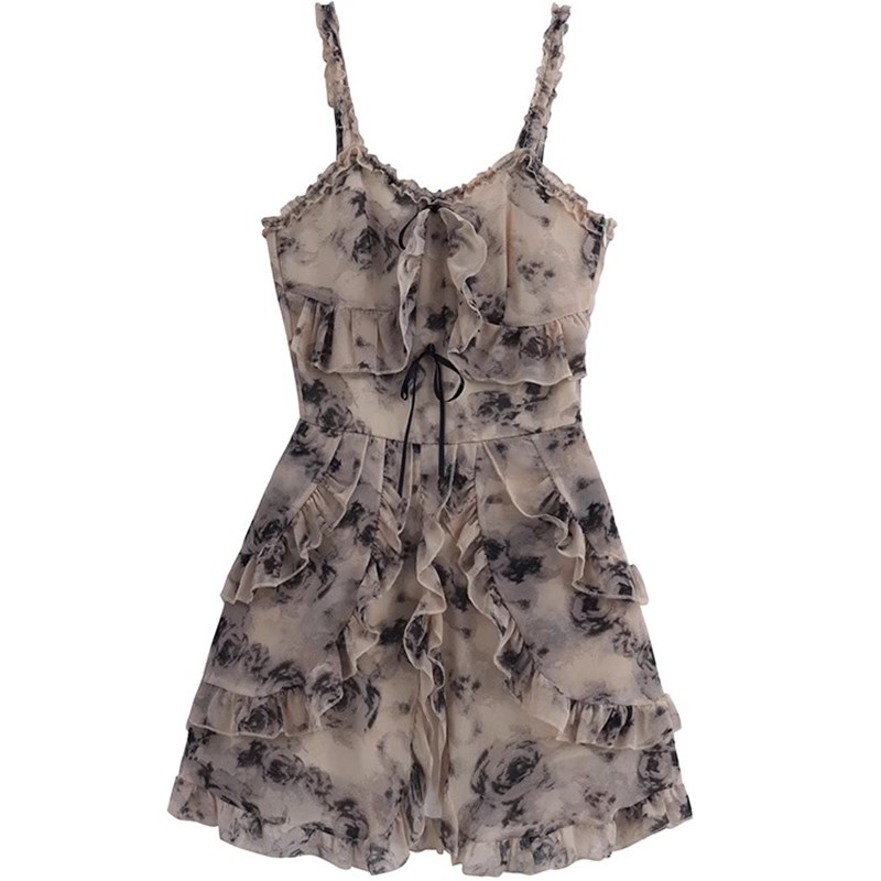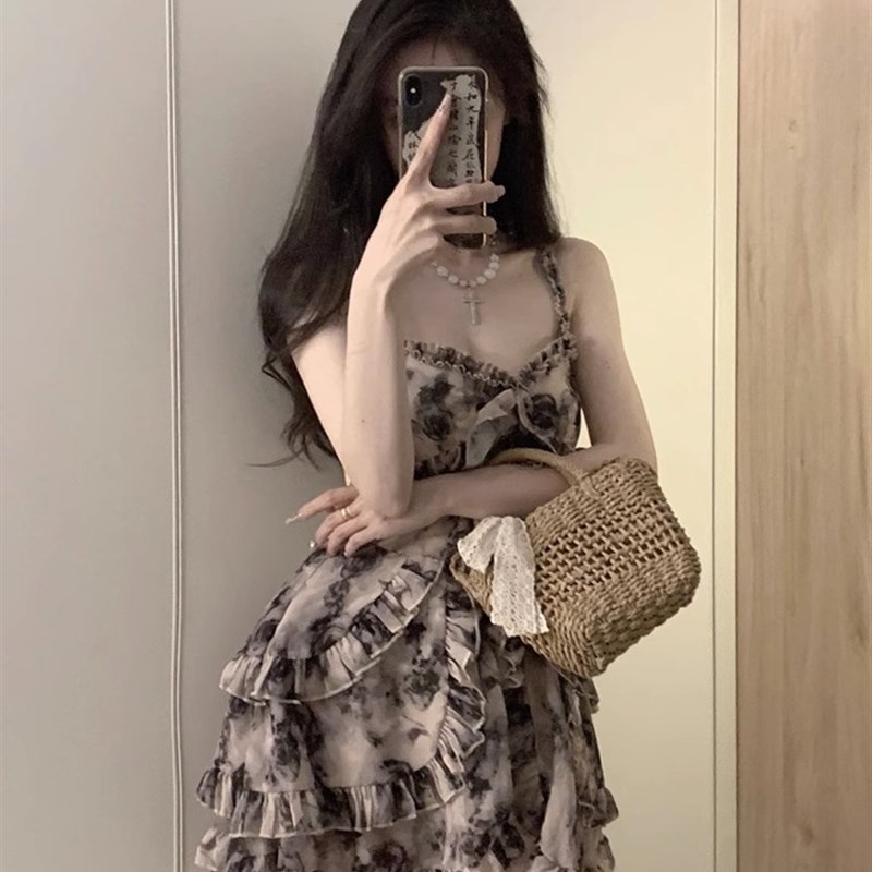 甜美风碎花雪纺吊带连衣裙女装夏季2023新款不规T则荷叶边短裙裙