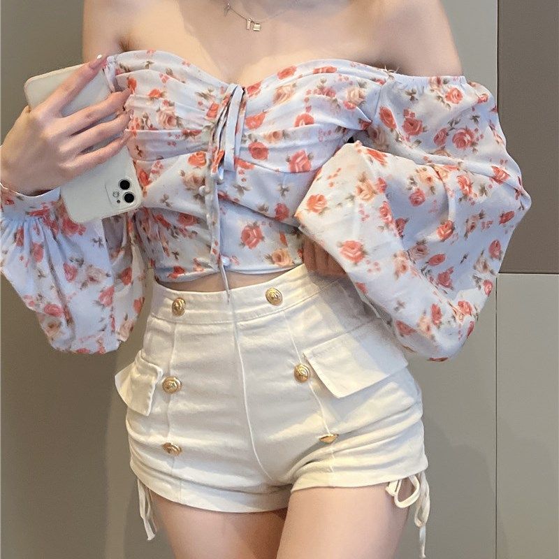 碎花露肩长袖雪纺衫女夏季新款甜美小清新气质女神范系带短款上衣