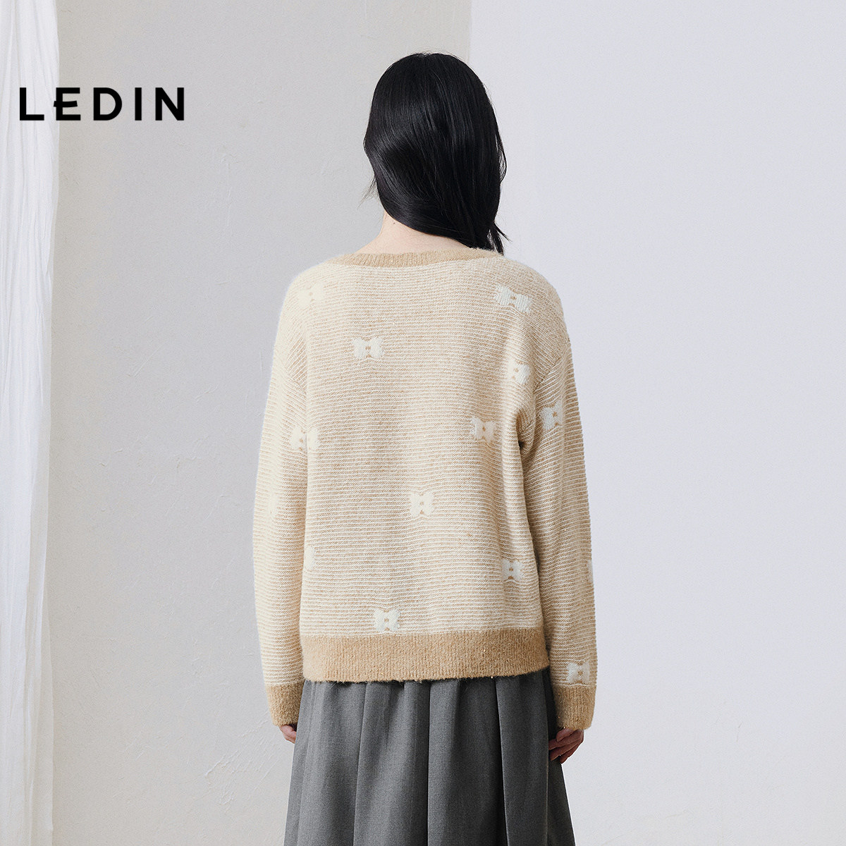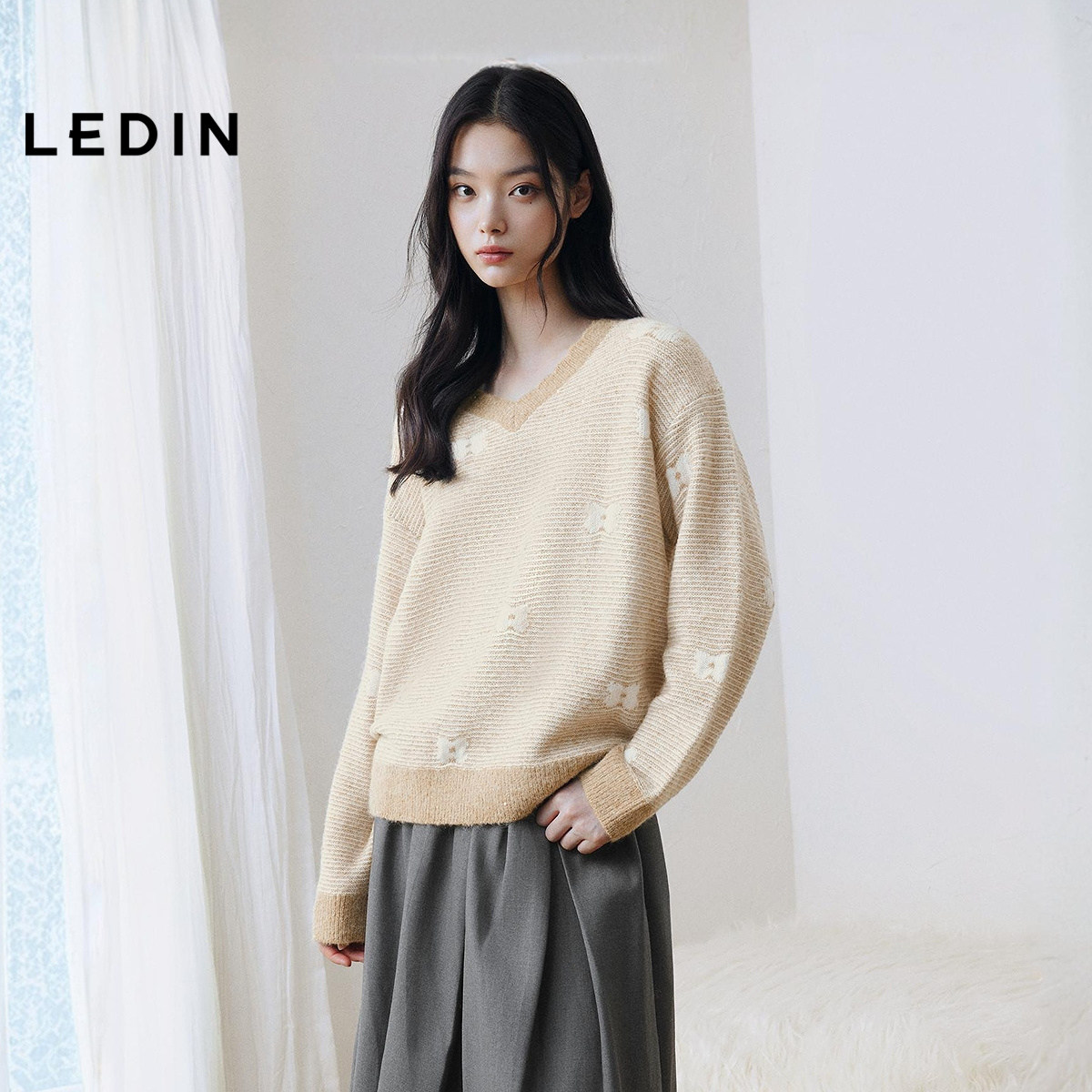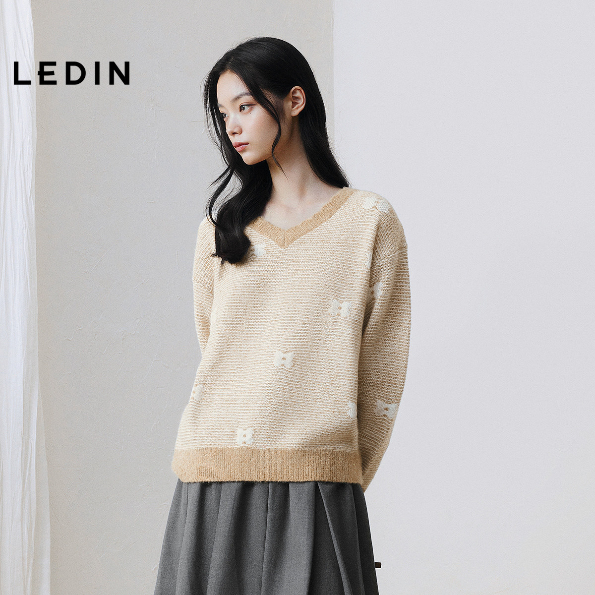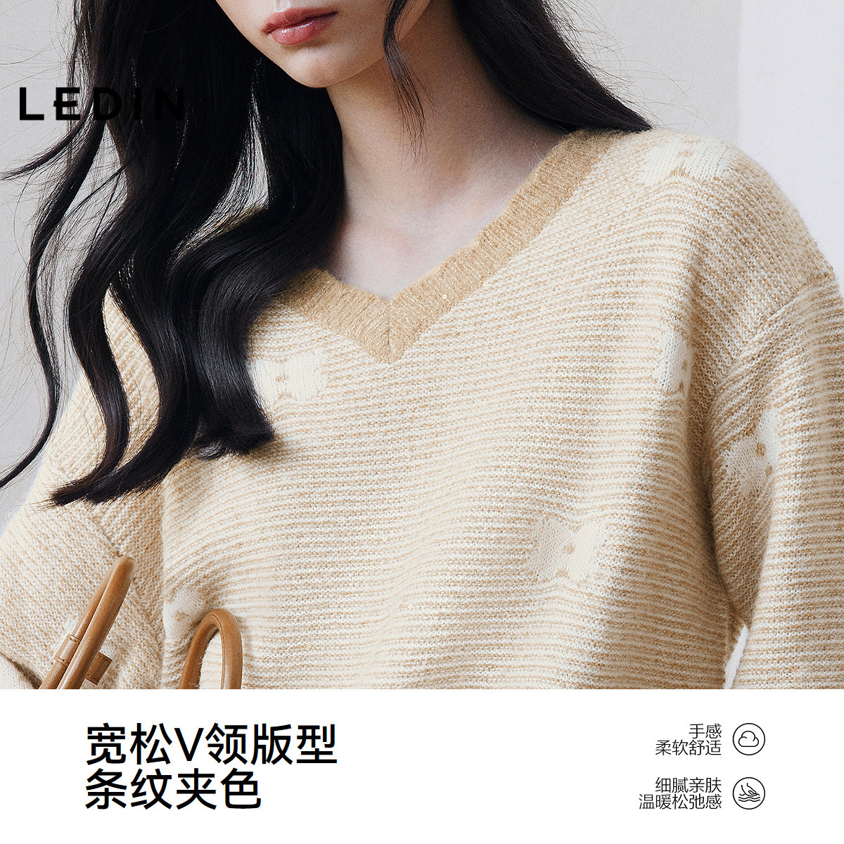 乐町花边V领毛针织衫25年冬季新款宽松条纹套头衫蝴蝶花上衣套衫
