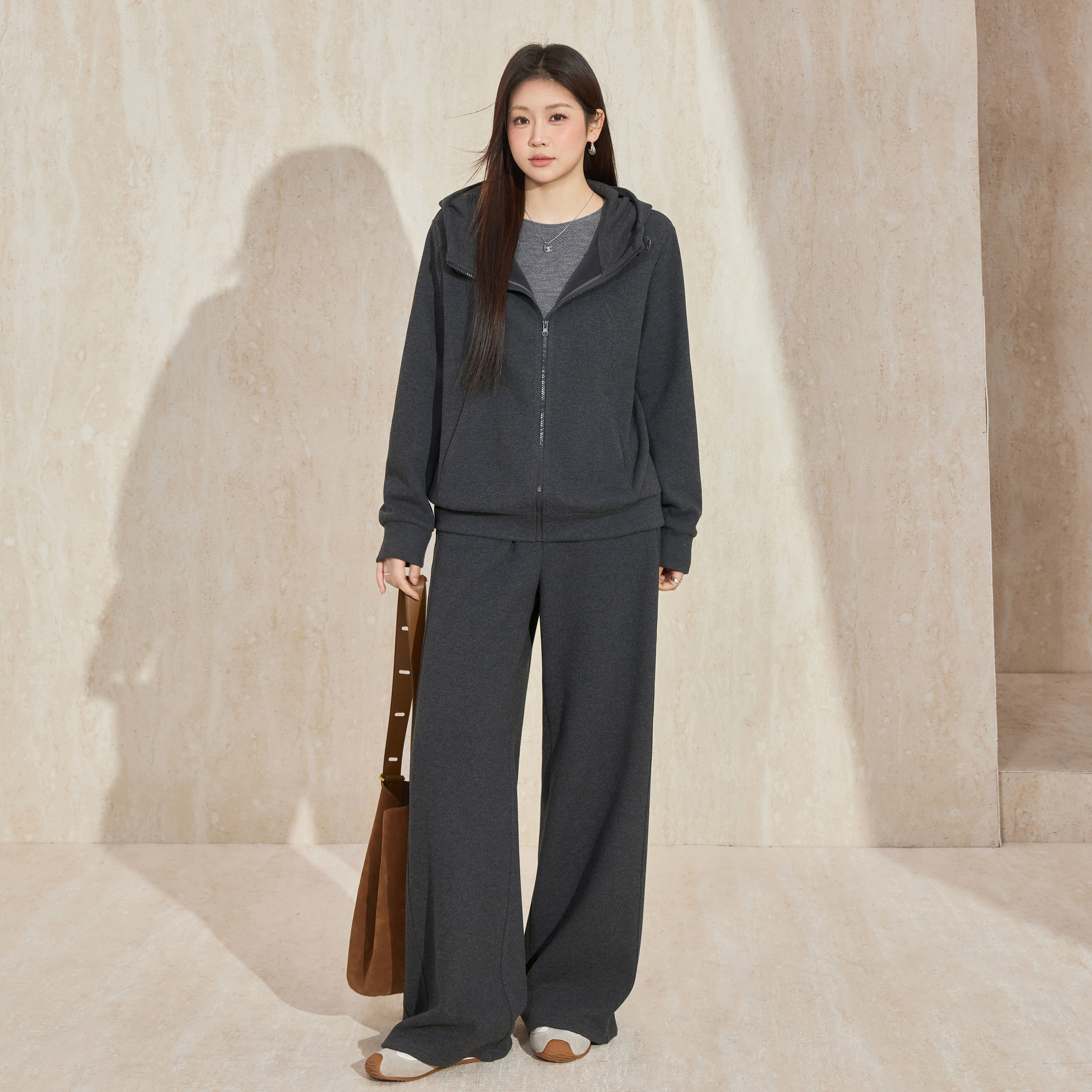 蓝语大码加绒加厚立领羽绒服马甲连帽拉链卫衣女直筒长裤休闲套装