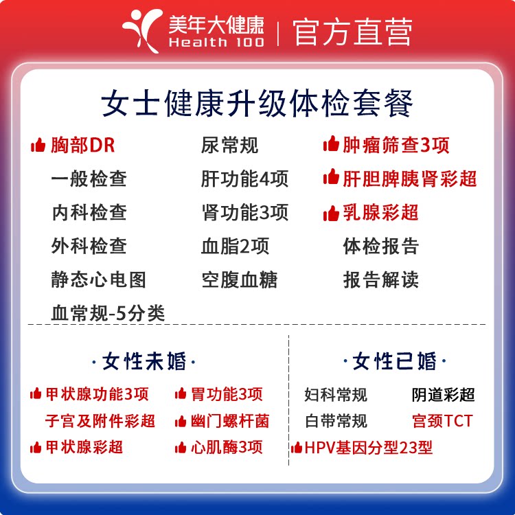 美年大健康女士健康升级体检套餐妇科HPV宫颈TCT乳腺彩超中青老年