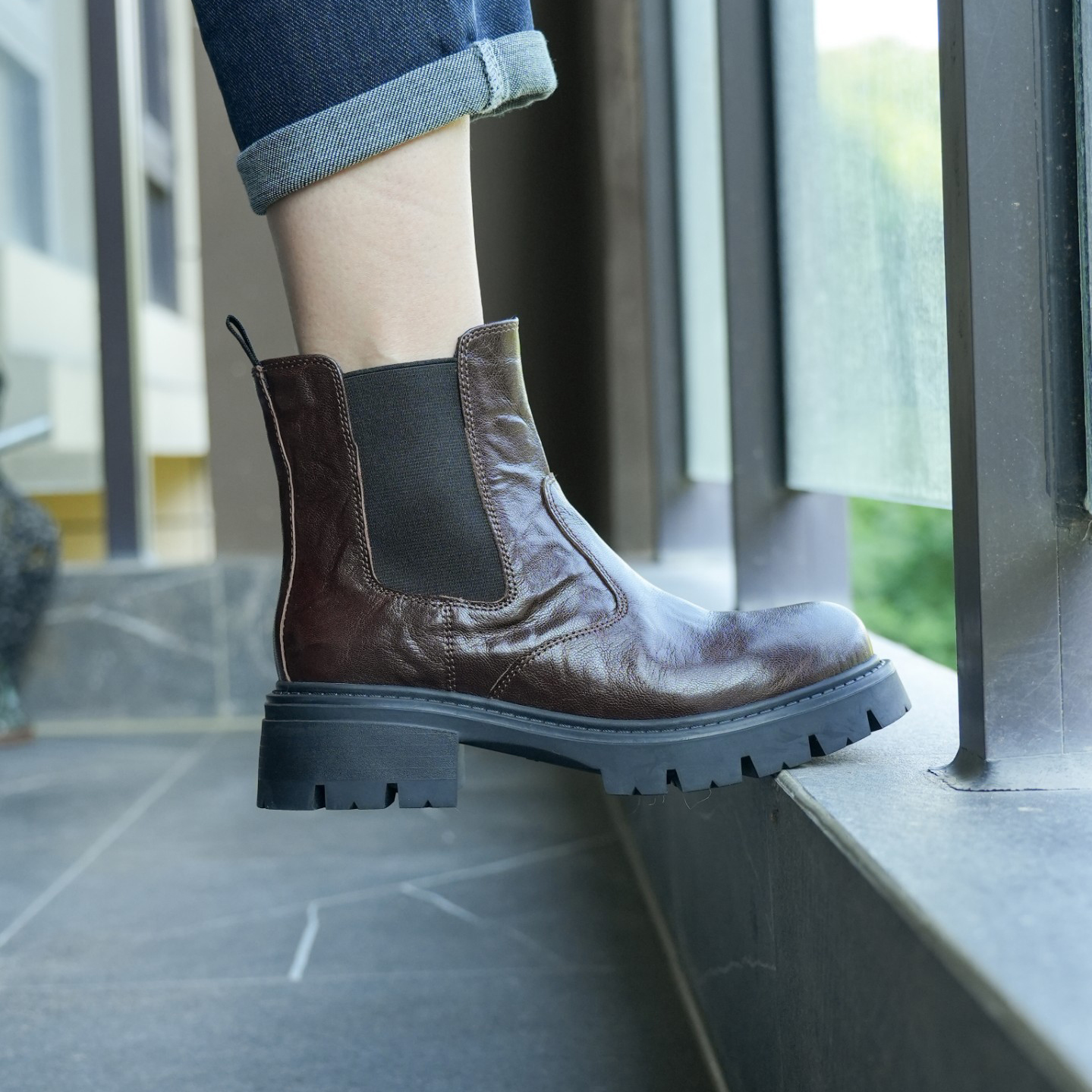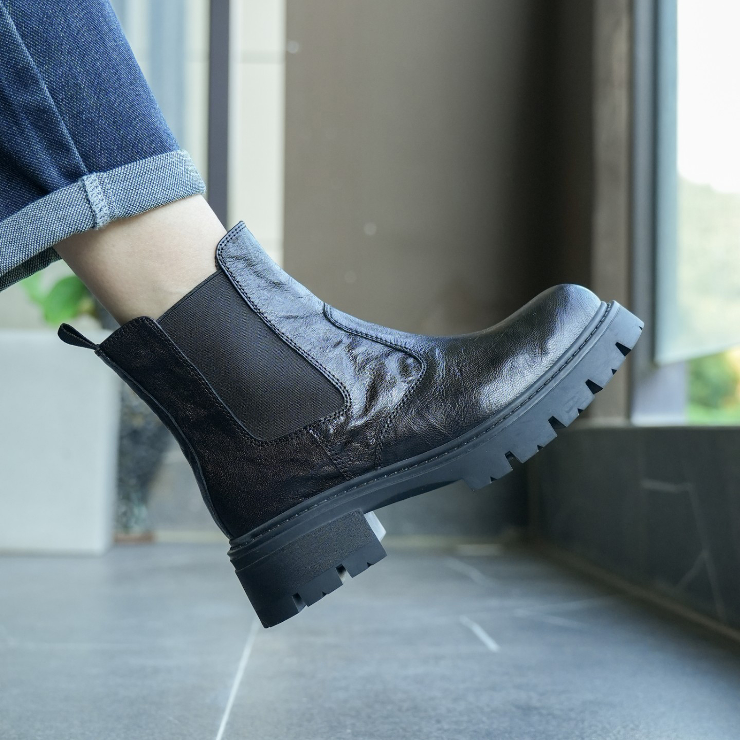 壹家shoes039020油蜡羊皮切尔西靴5cm圆头平底短靴厚底真皮女靴