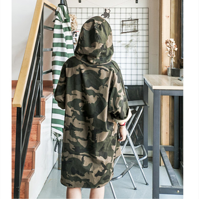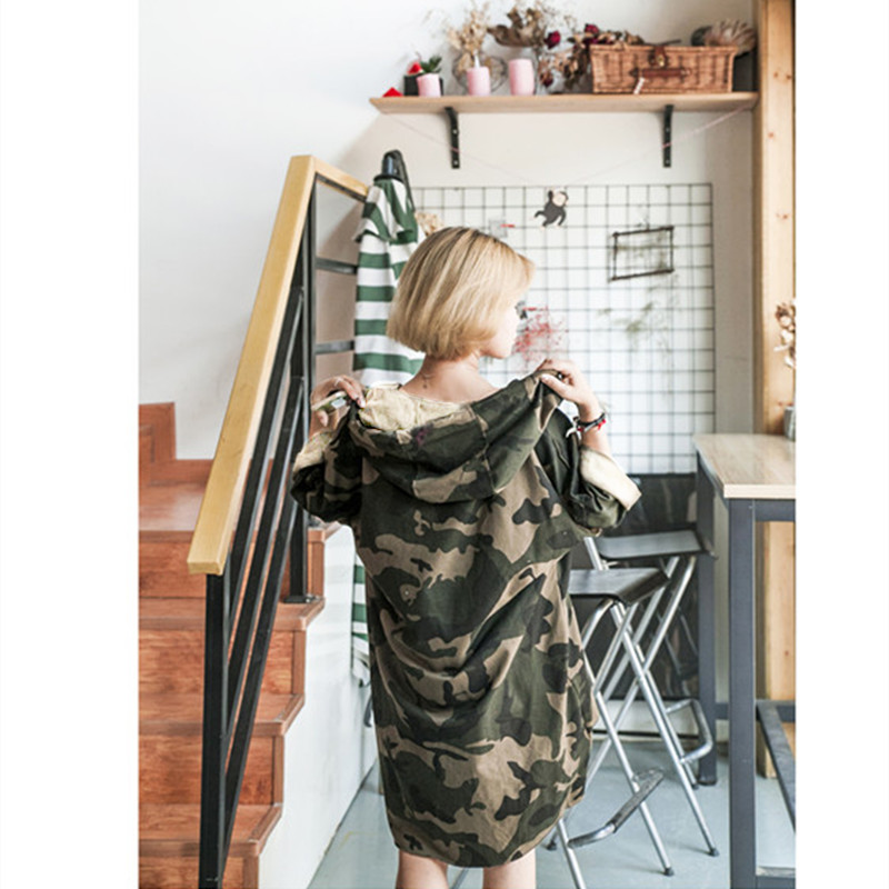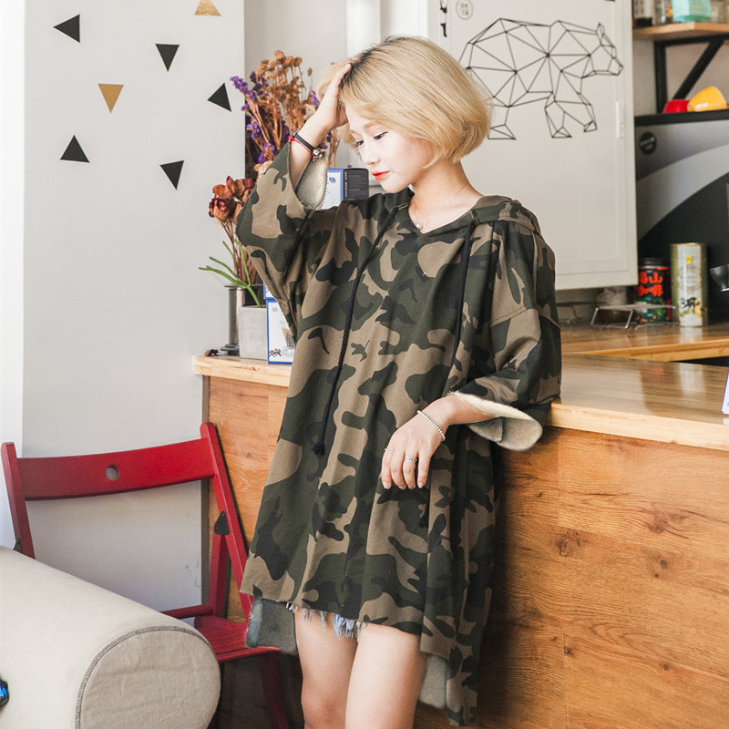 秋季薄款胖mm宽松大码军绿迷彩卫衣外套女长袖中长款连帽连衣裙潮