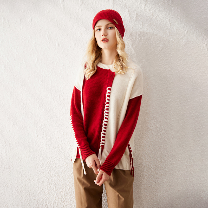 纯羊绒圆领撞色设计宽松羊绒衫女
