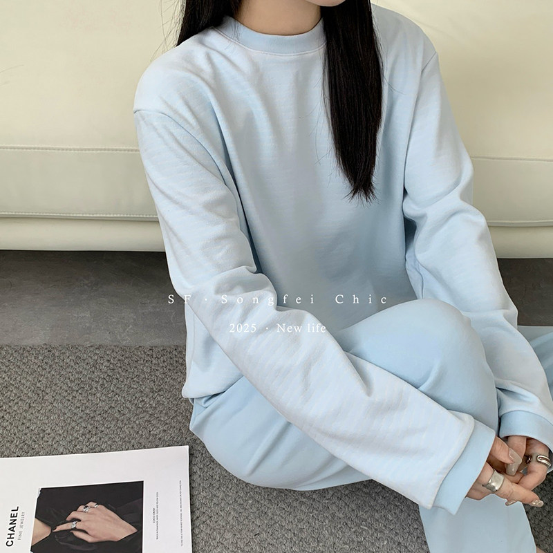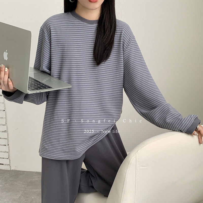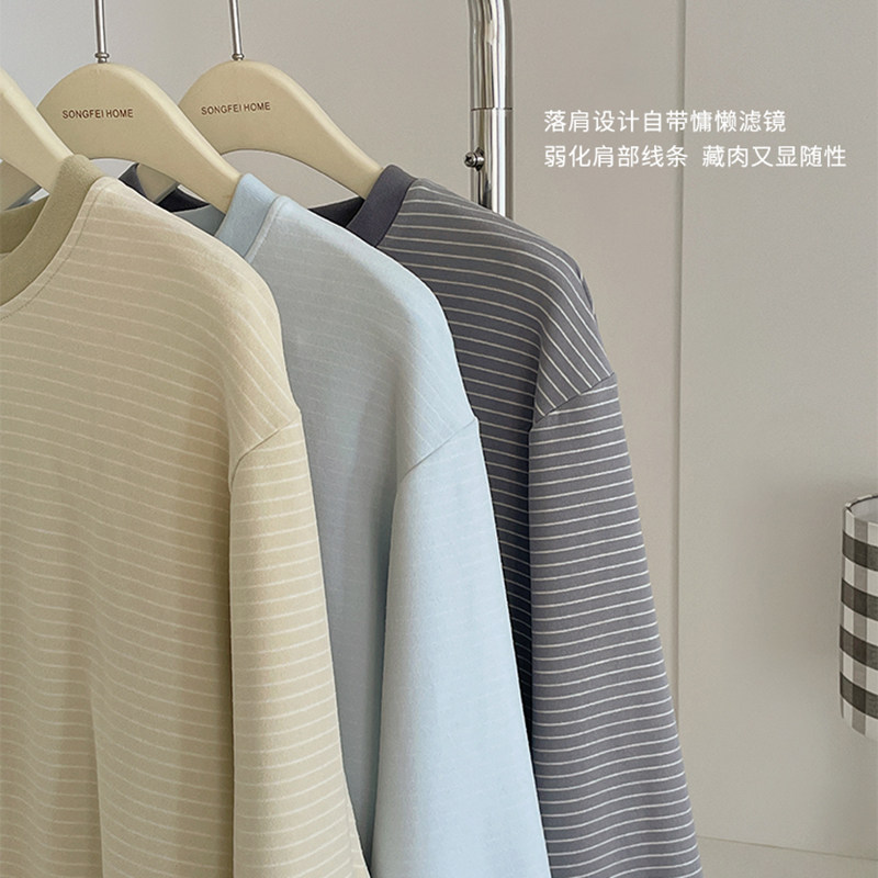 2025秋冬家居服横条磨毛睡衣女套装新款慵懒宽松保暖套头二件套