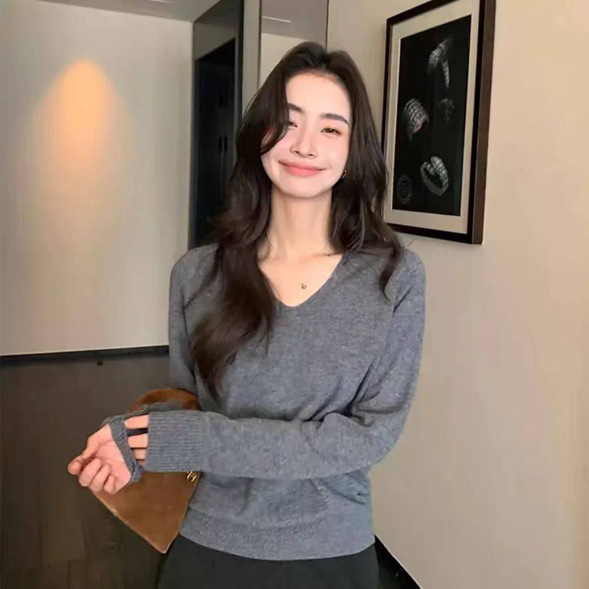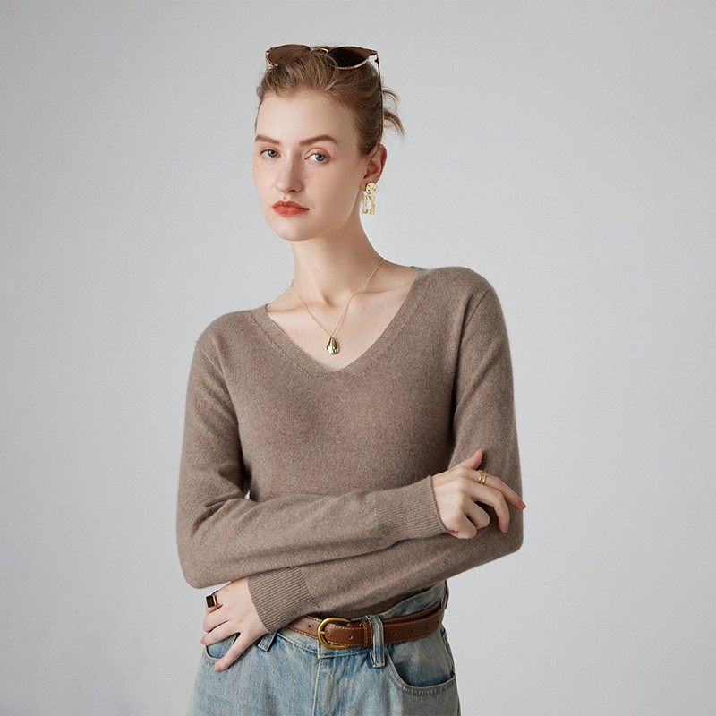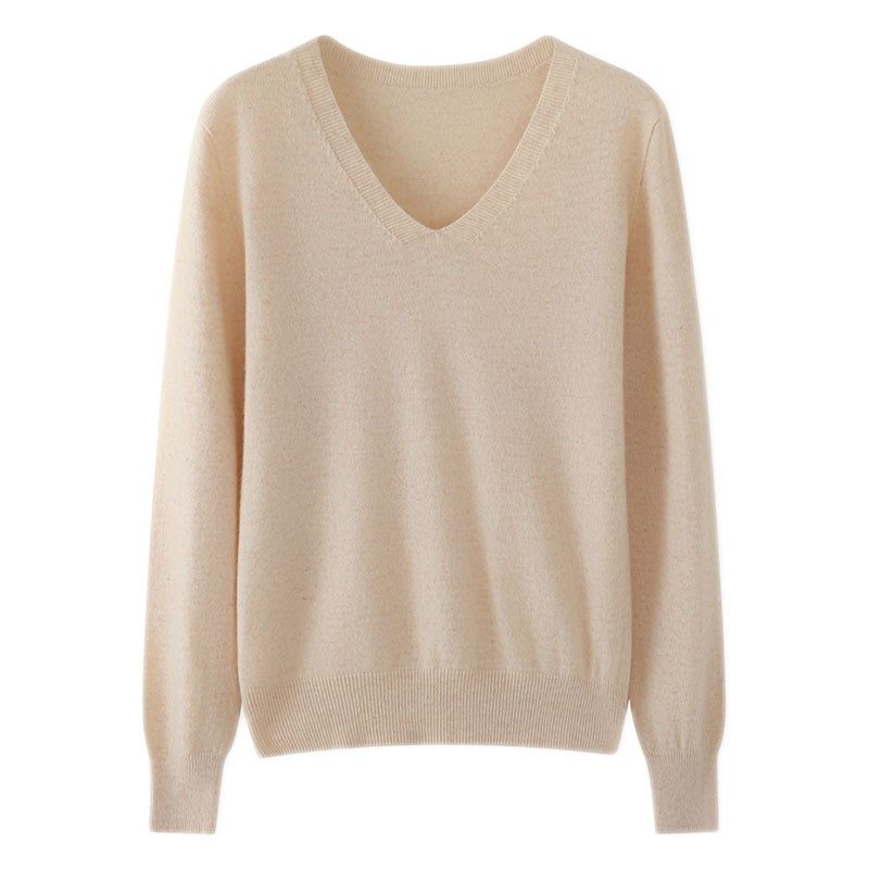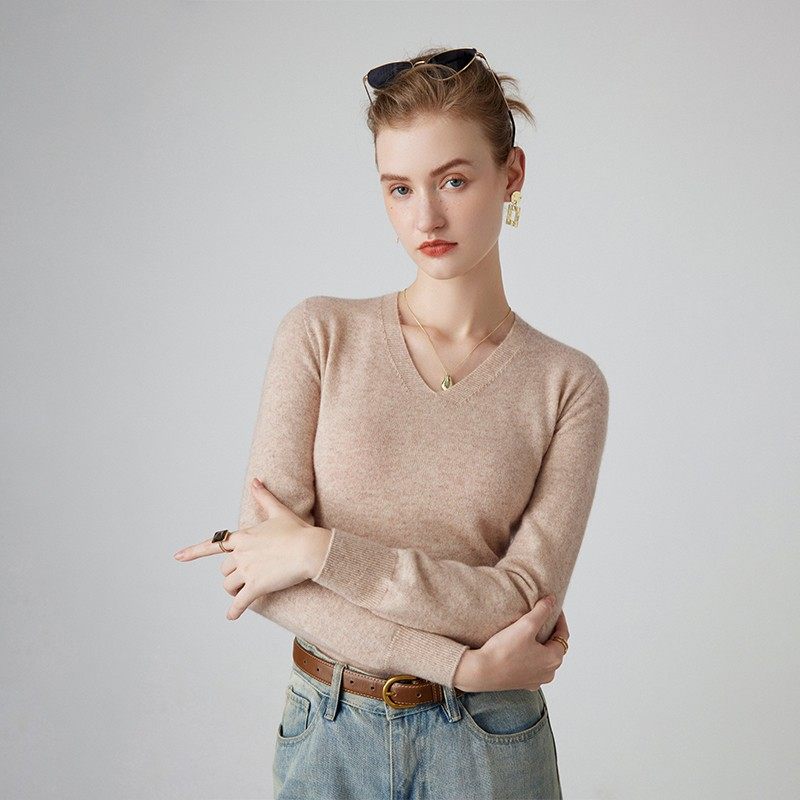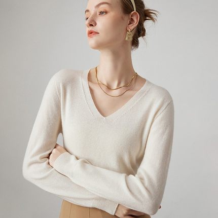 鄂尔多斯市无缝一体可机洗V领羊毛衫女纯白色内搭针织羊绒打底衫