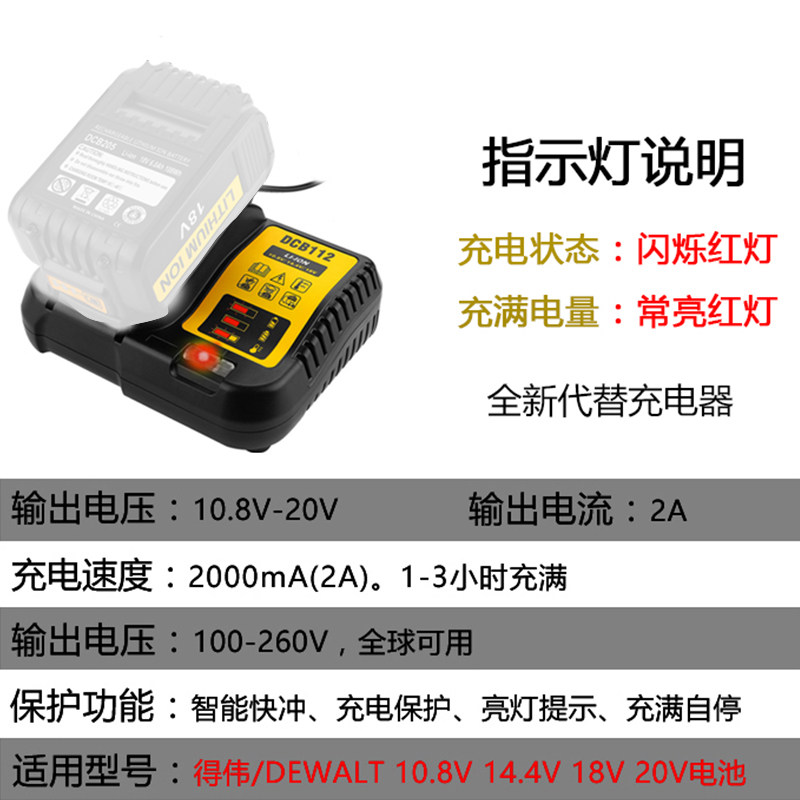 适应于得伟电钻10.8V12V14.4V18V20VDCB112锂电池通用配件充电器