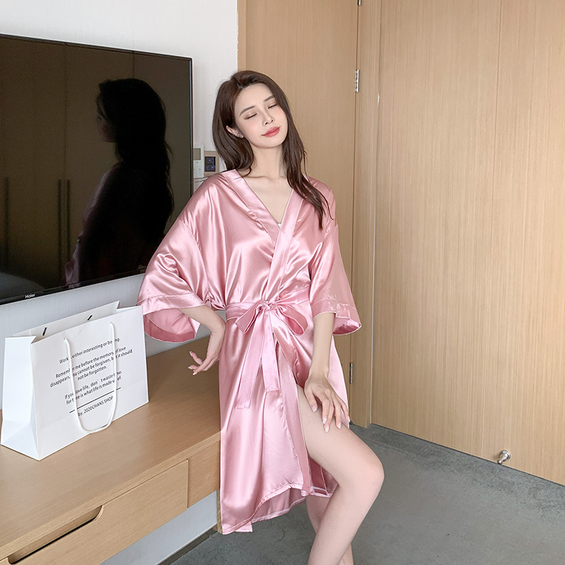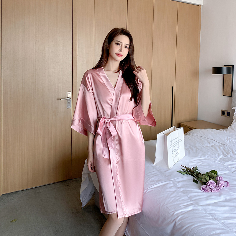 2025新款夏季冰丝睡裙女开衫性感浴袍美容院丝滑凉感粉色睡衣长款