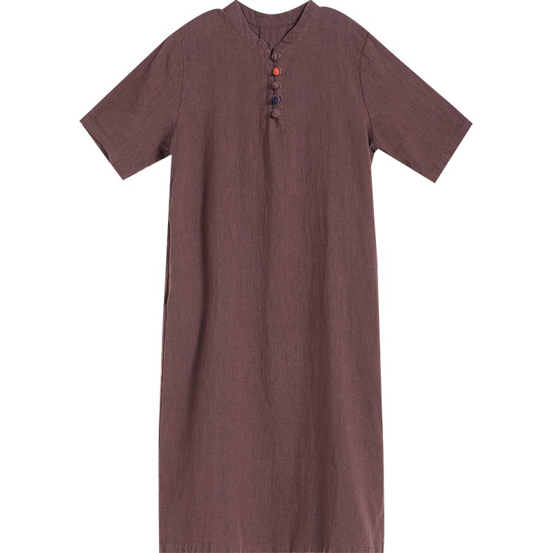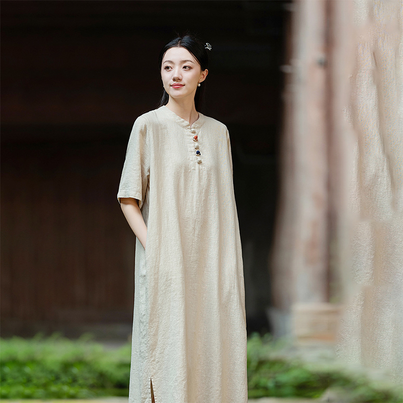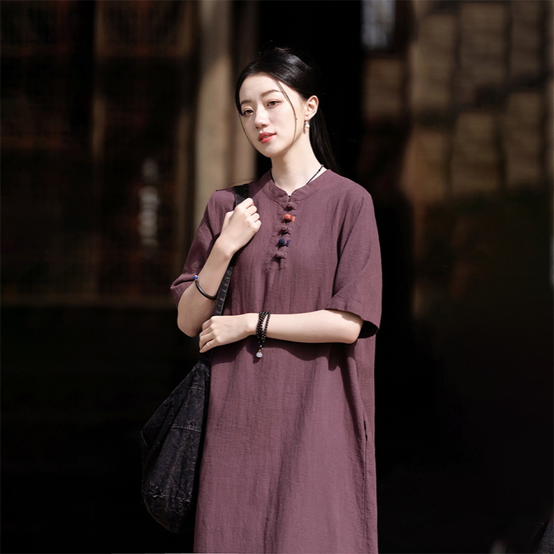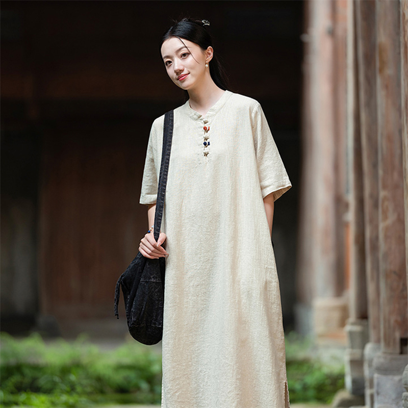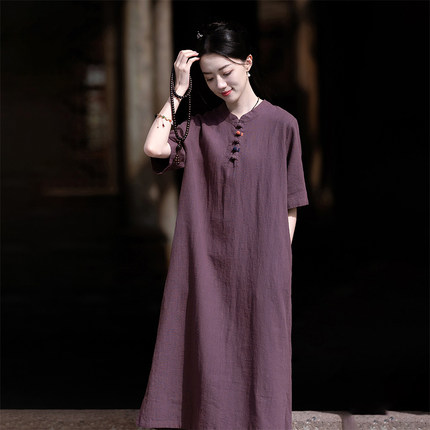苎麻新中式复古短袖连衣裙女式夏季2025新款棉麻改良长裙禅意袍子