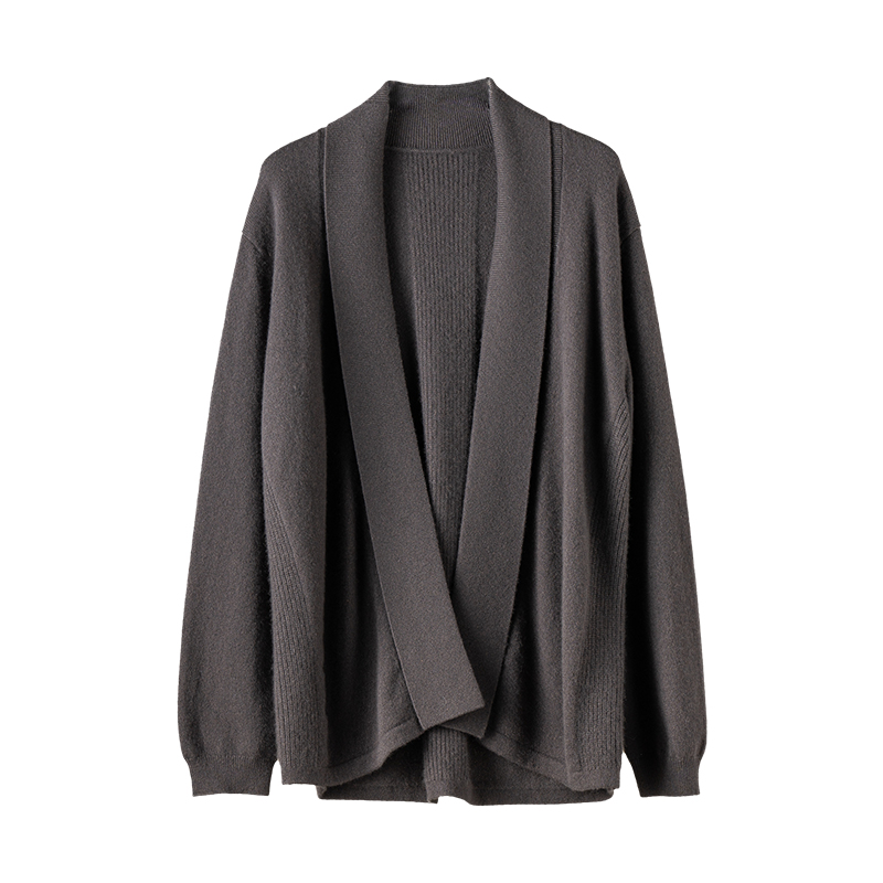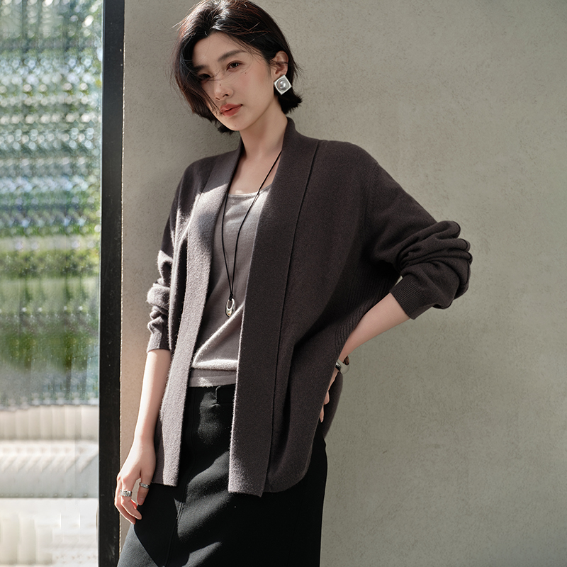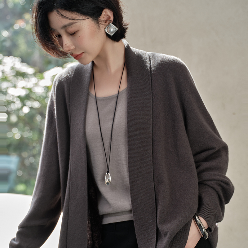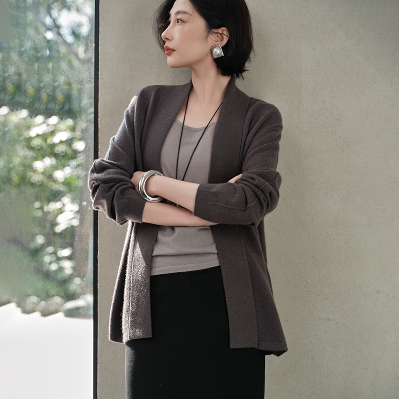 秋冬新款纯山羊绒开衫女中长款加厚翻领无扣气质减龄简约针织外套