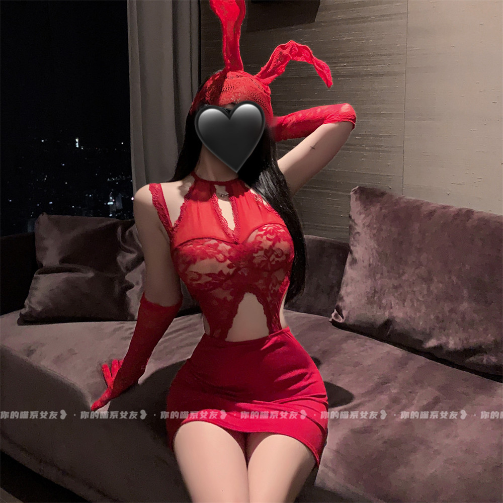 喵:纯欲蕾丝挂脖辣妹修身内衣性感镂空包臀短裙御姐秘书制服套装