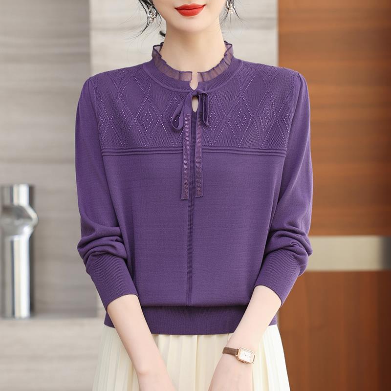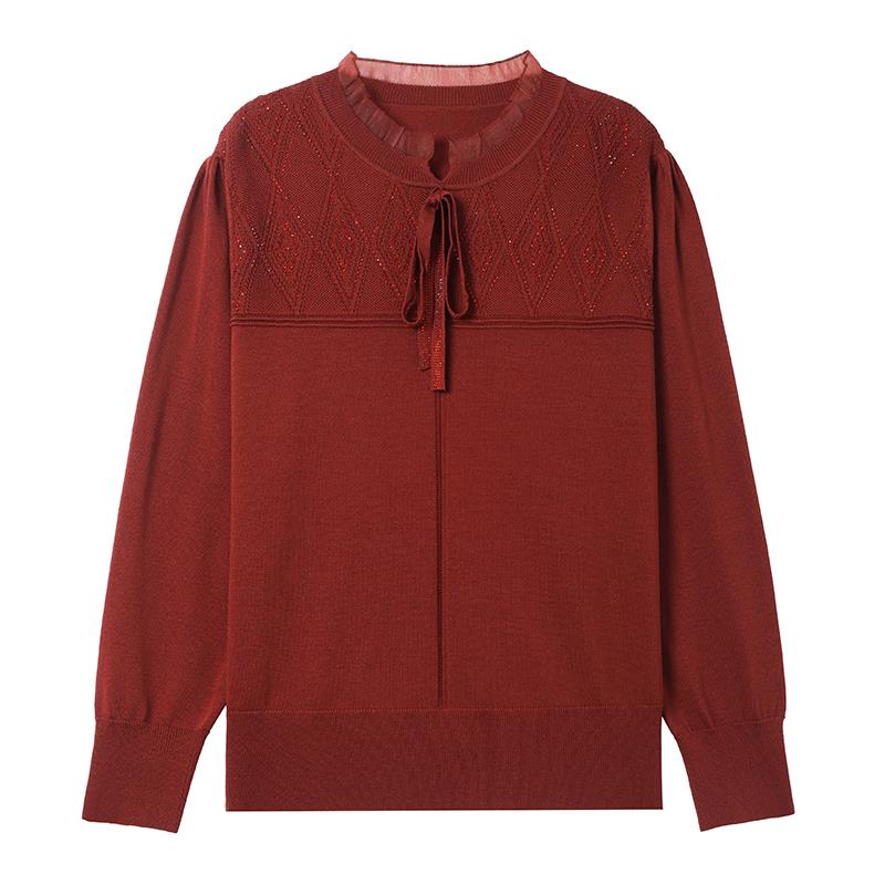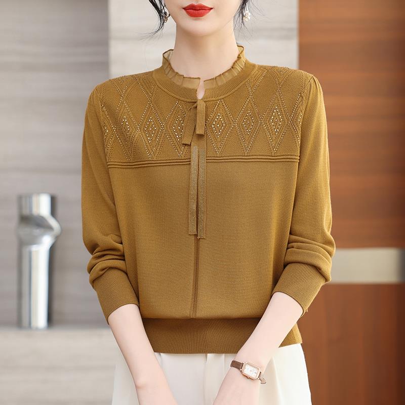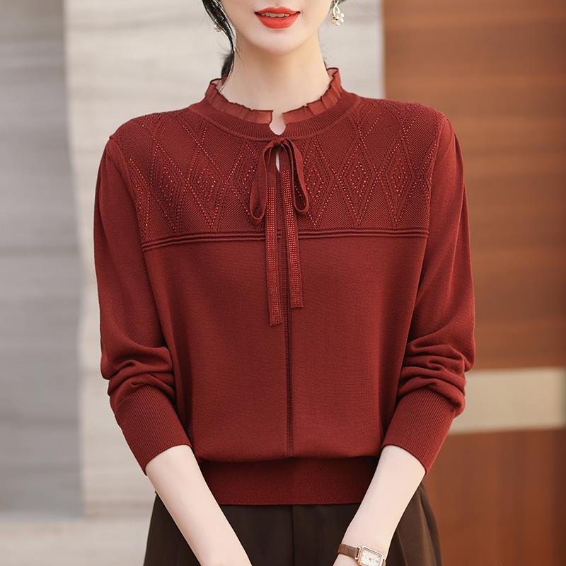 春秋新款针织衫女桑蚕丝长袖T恤中年妈妈装系带冰丝打底衫上衣薄