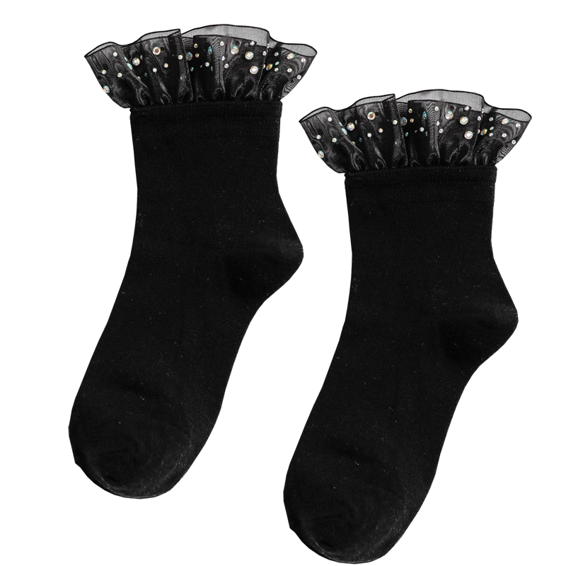 3双 欧根纱时尚彩钻花边袜子女日系可爱洛丽塔女袜软妹烫钻中筒袜