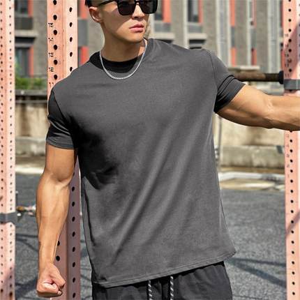 男健身运动训练收袖口小领口纯棉重磅透气显大肌肉垫肩短袖T恤
