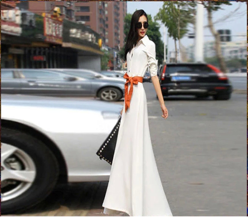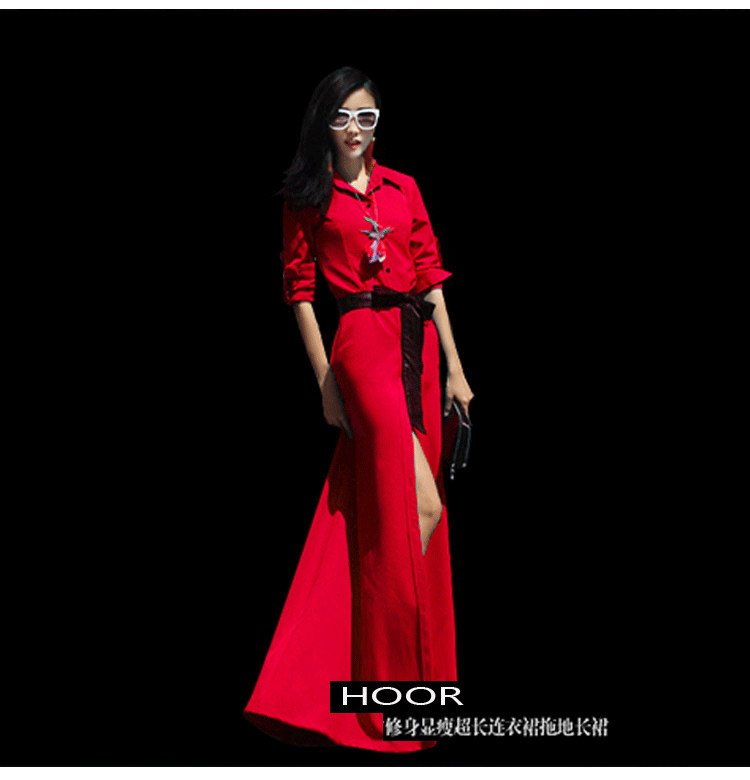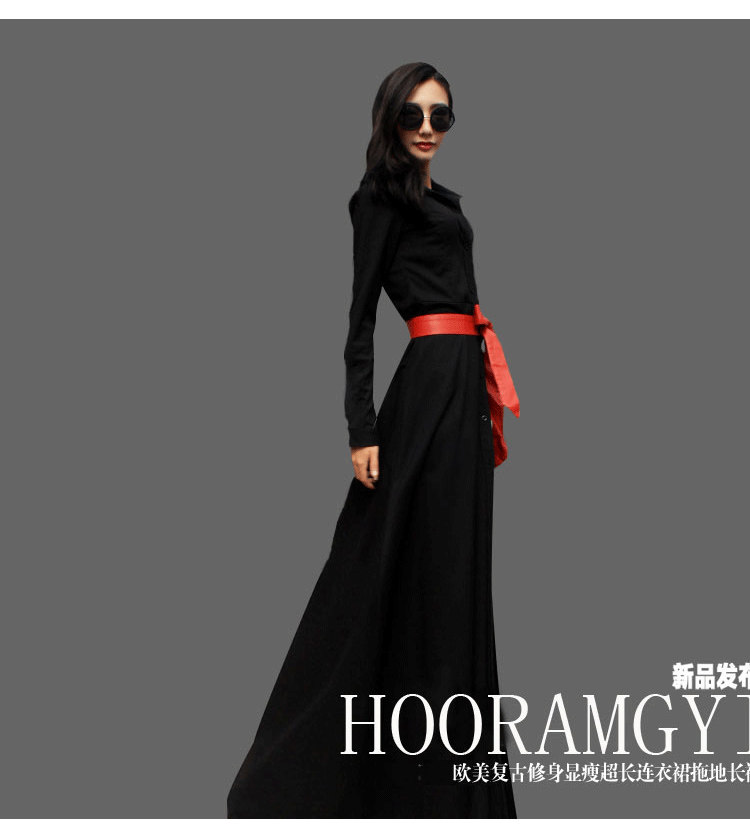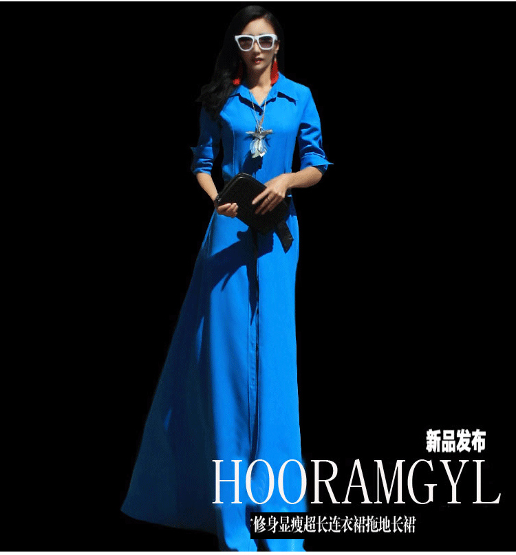 新款欧美春夏女装修身显瘦中长袖大摆超长款风衣衬衣时尚连衣裙