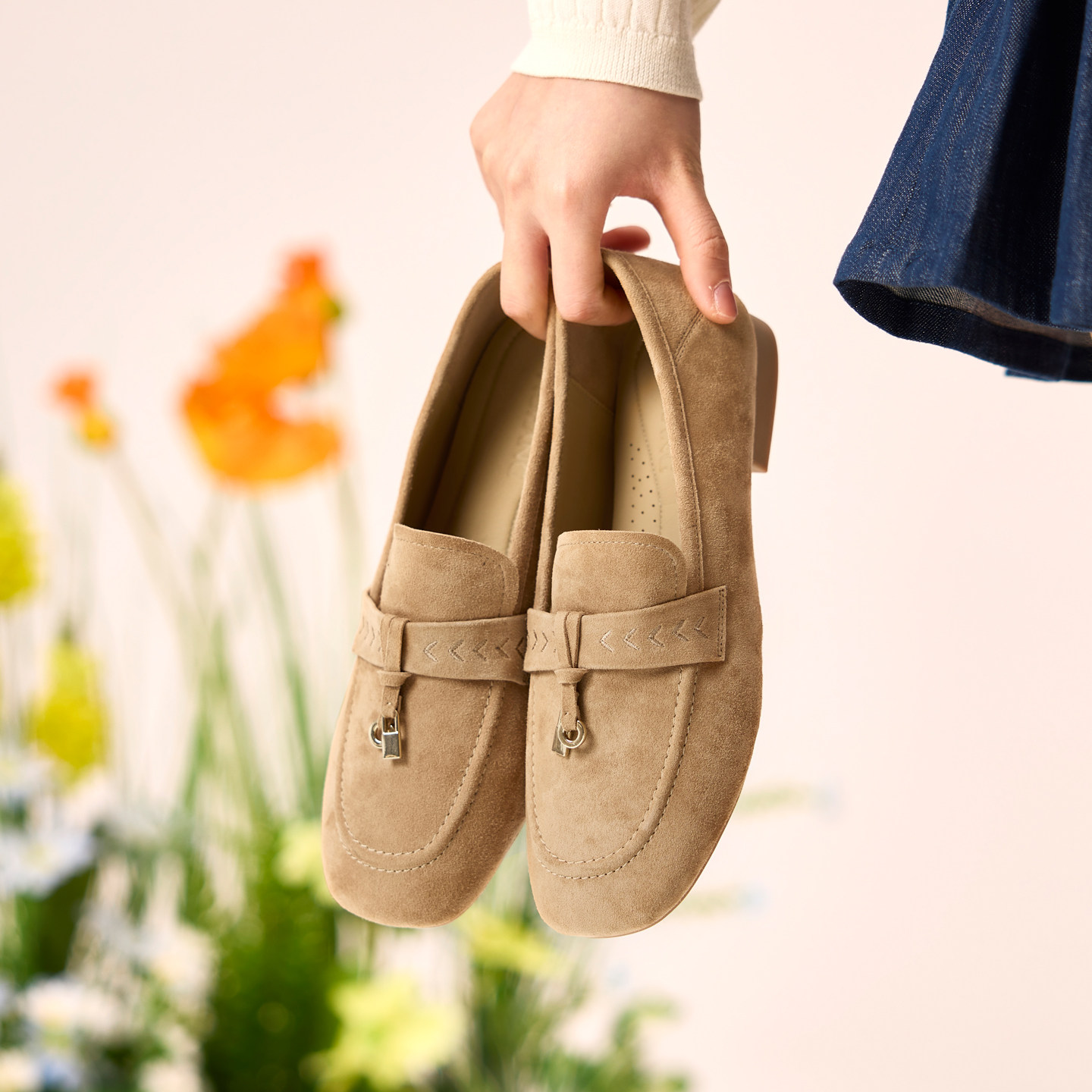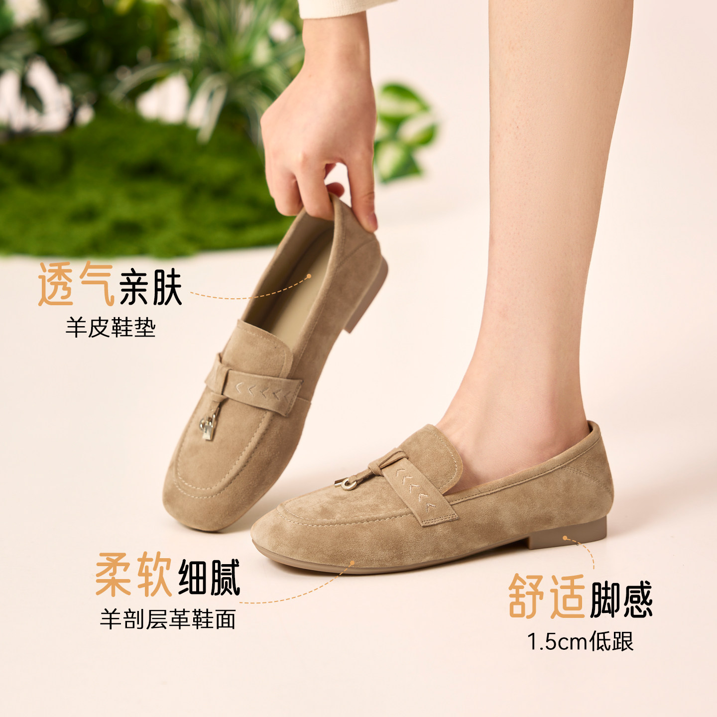 奥康 女鞋2026春季新款乐福鞋质感真皮绒面浅口单鞋两穿通勤平底