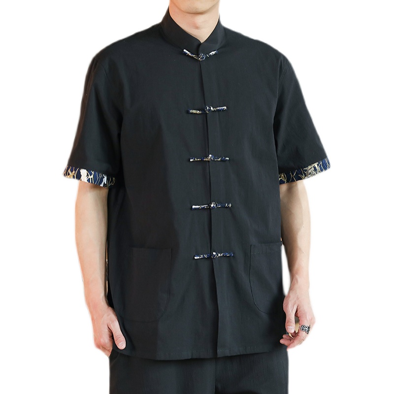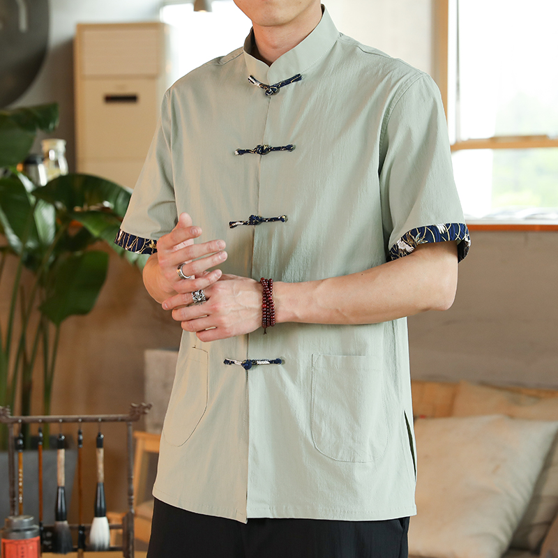 中国风短袖衬衫男夏季薄款中式休闲复古宽松青年盘扣唐装立领衬衣