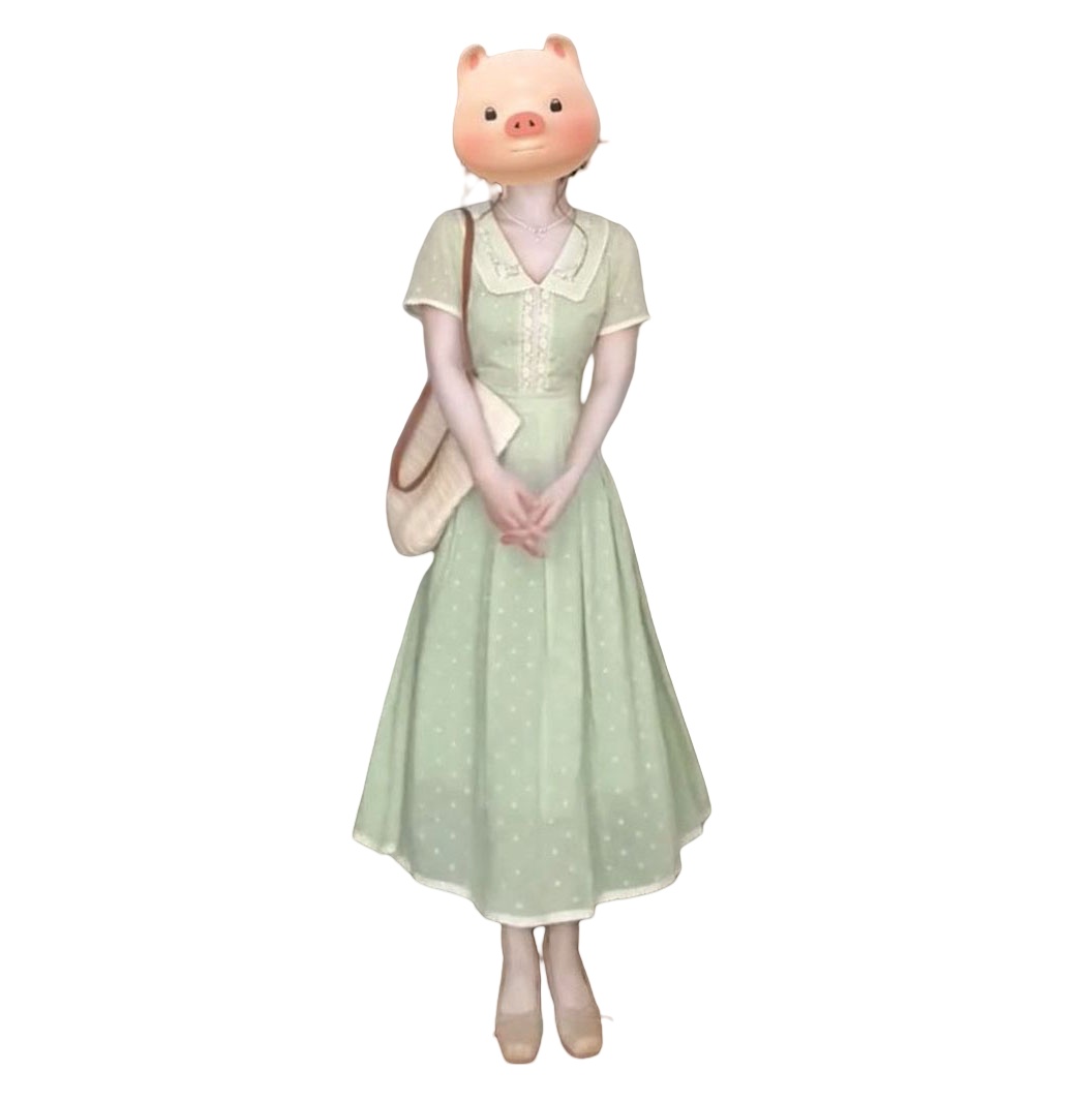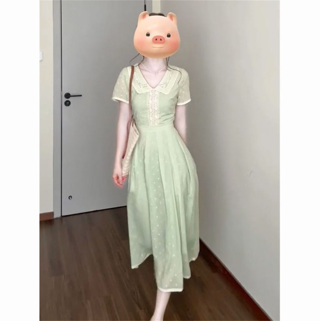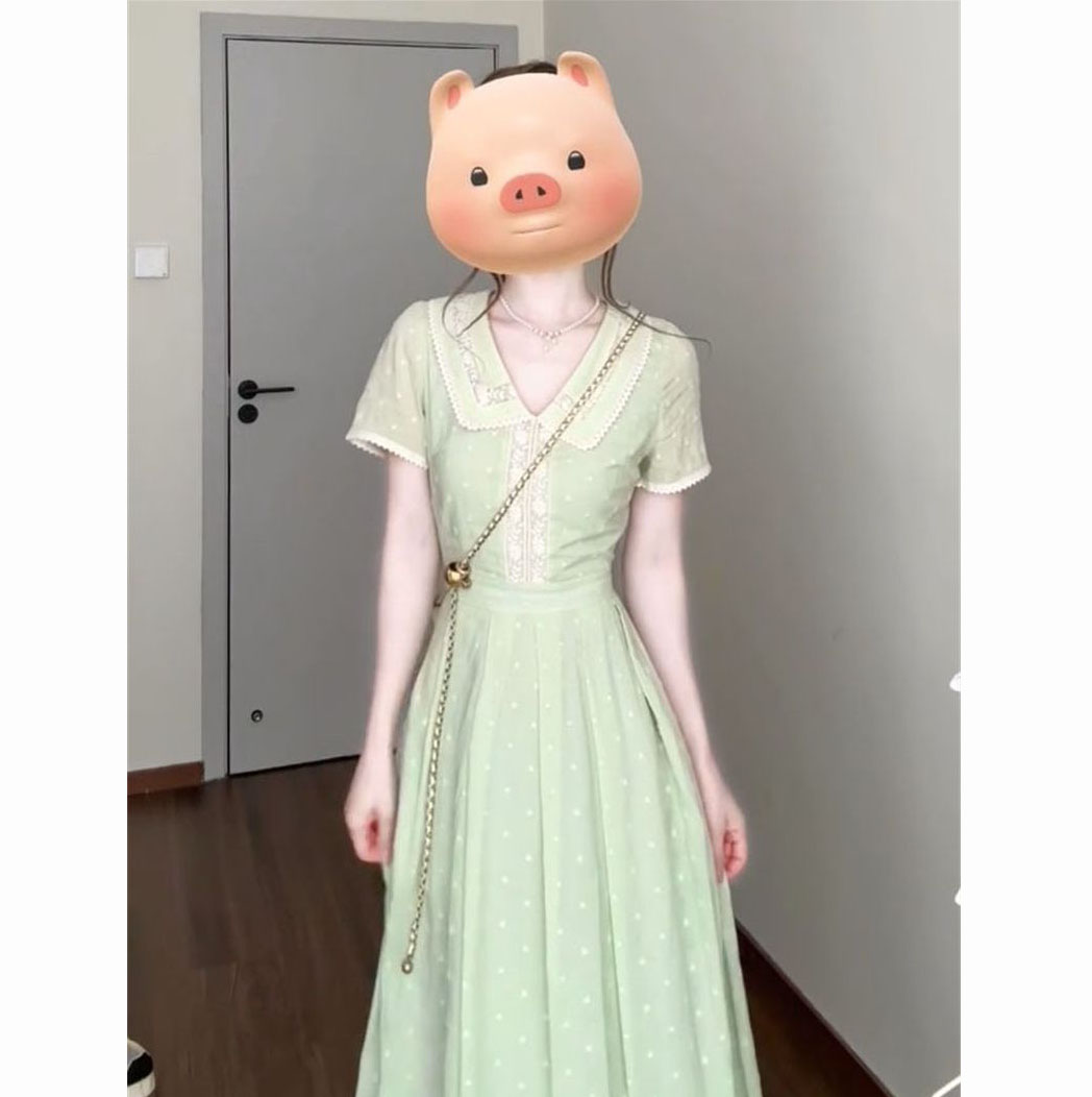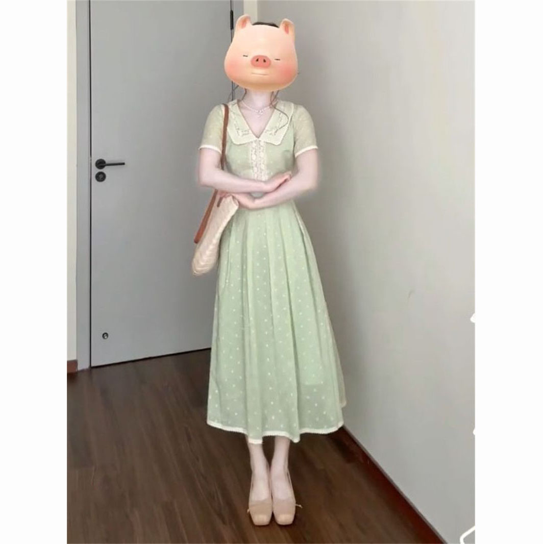 夏季温柔风蕾丝拼接镂空提花波点连衣裙淑女气质收腰显瘦别致长裙