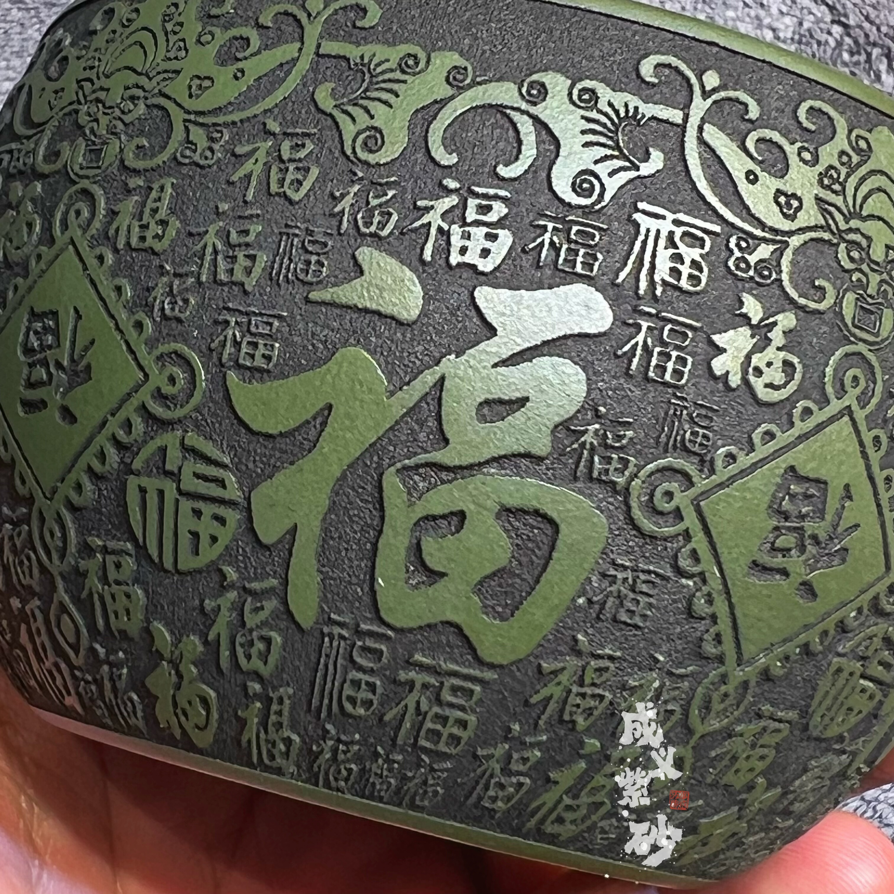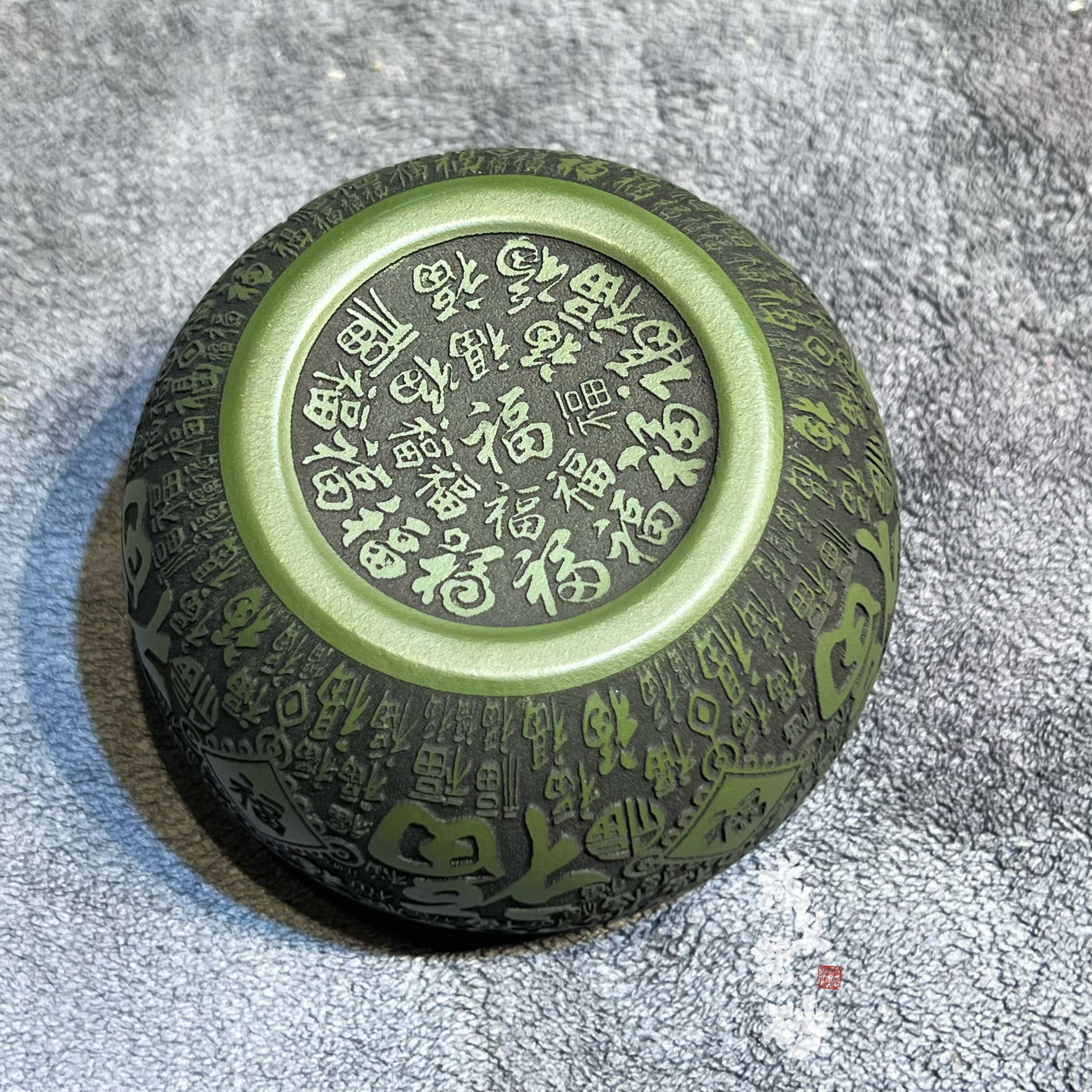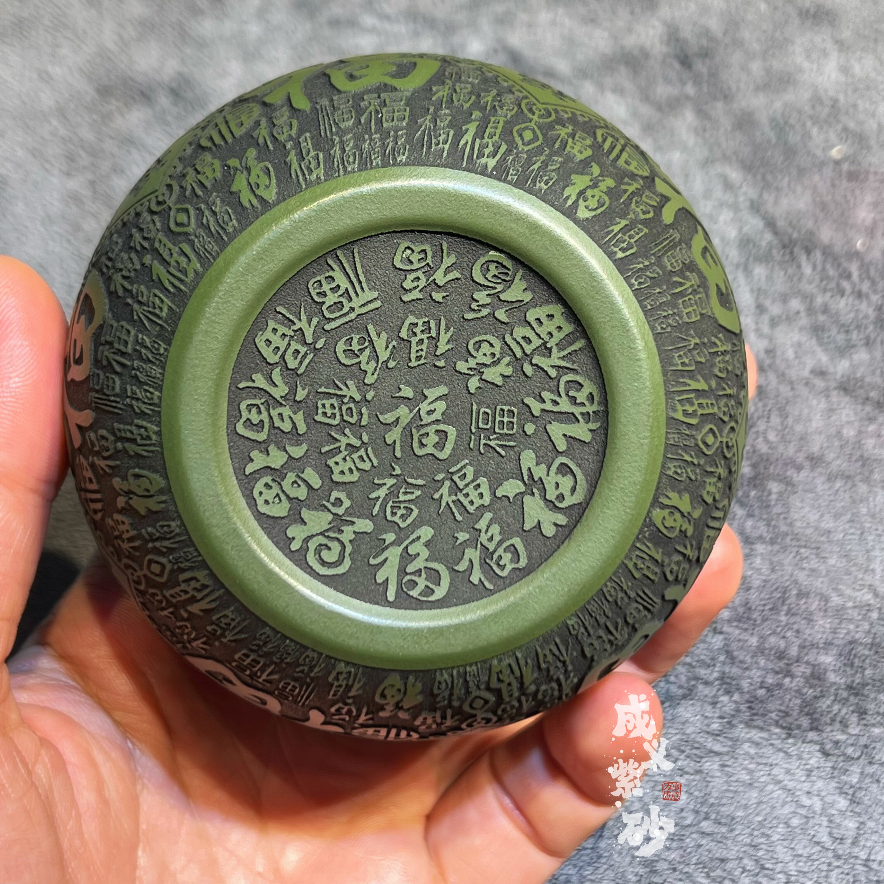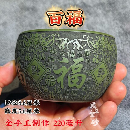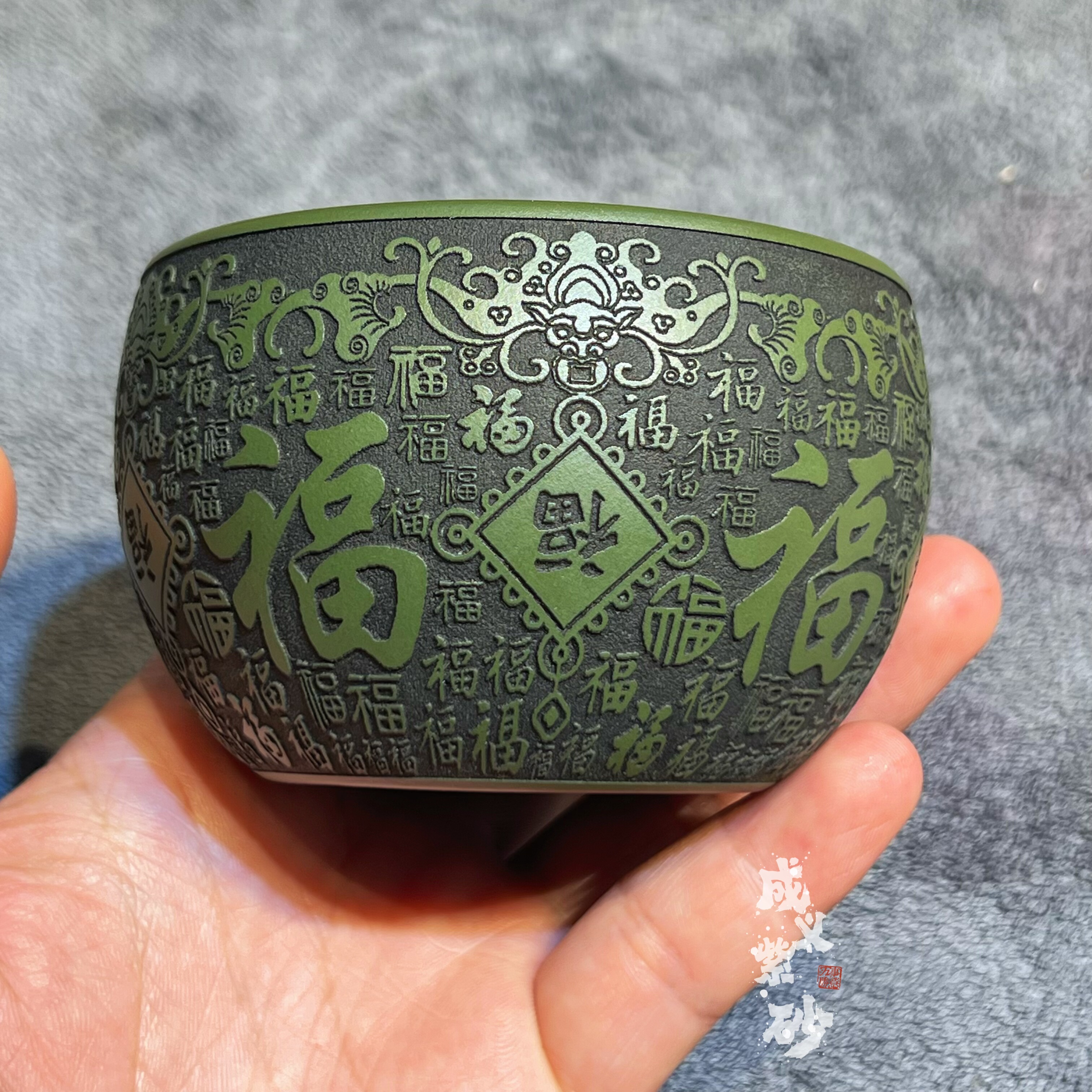 宜兴全手工紫砂茶具原矿绿泥泥料刻绘满福主人杯品茗杯容量200ml