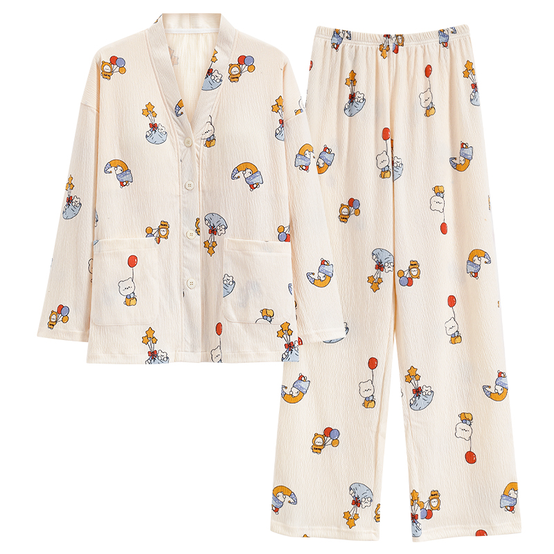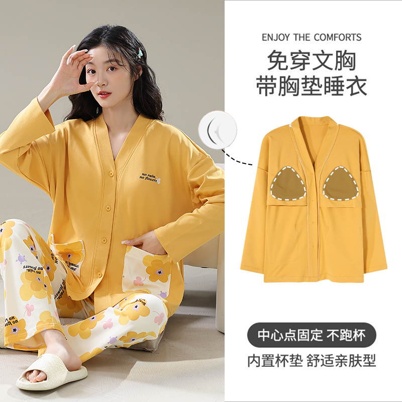 北极绒带胸垫睡衣女春秋季可爱纯棉长袖长裤开衫防凸点家居服套装