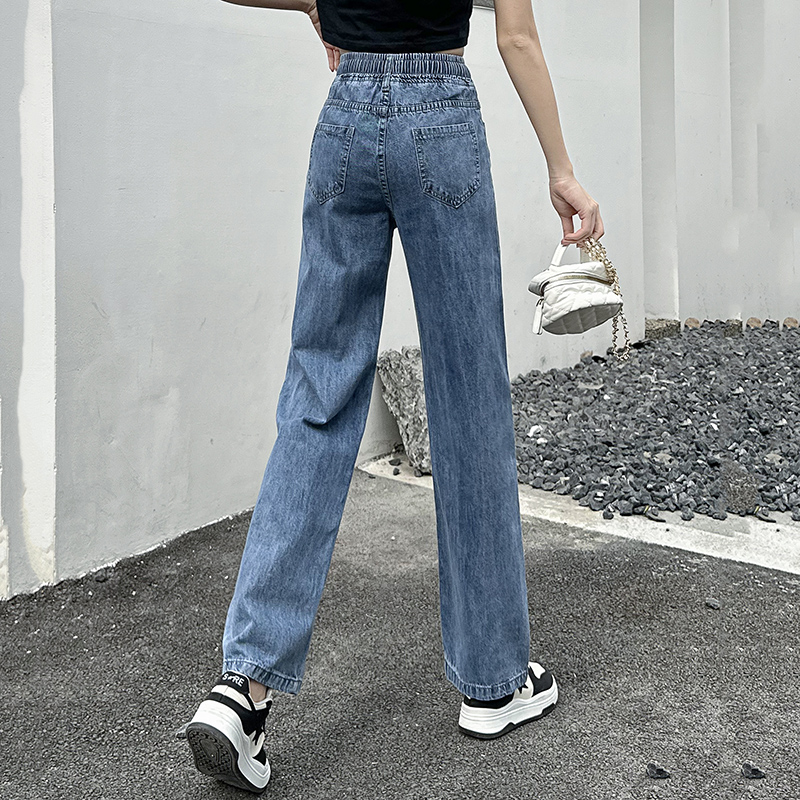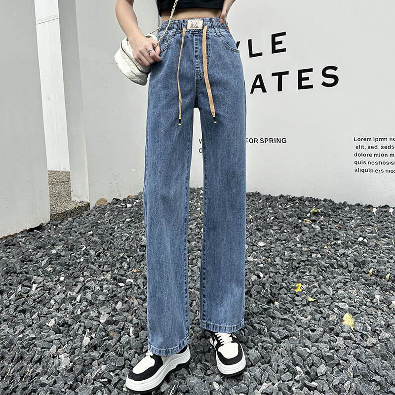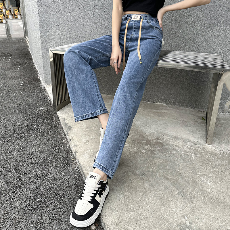 松紧腰阔腿牛仔裤女春夏新款小个子学生休闲窄版直筒哈伦拖地长裤