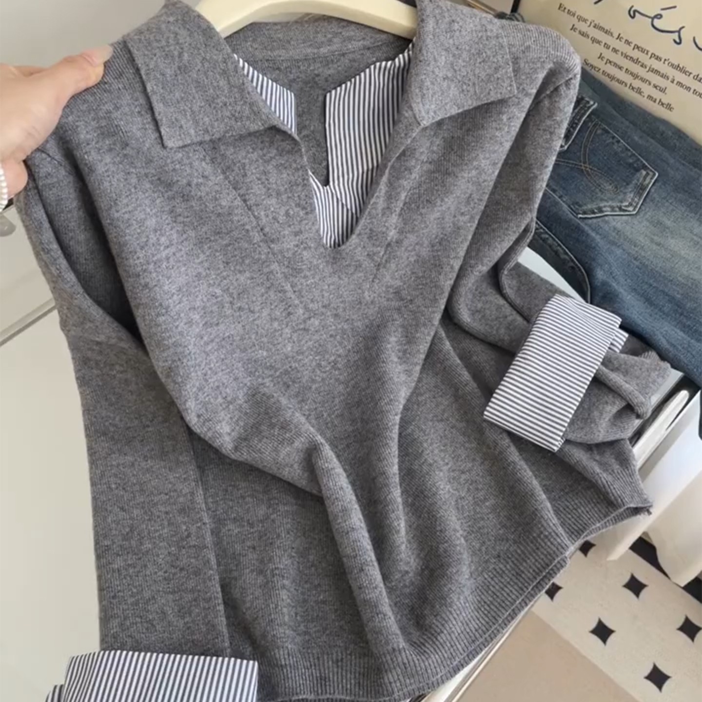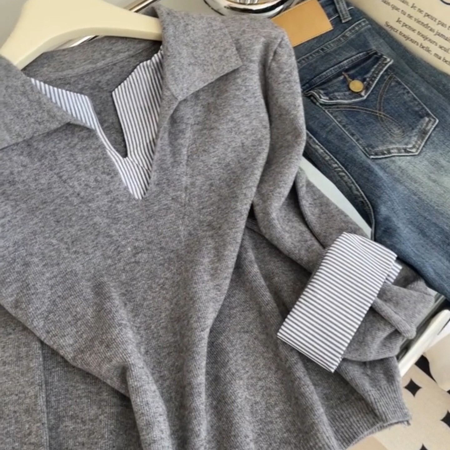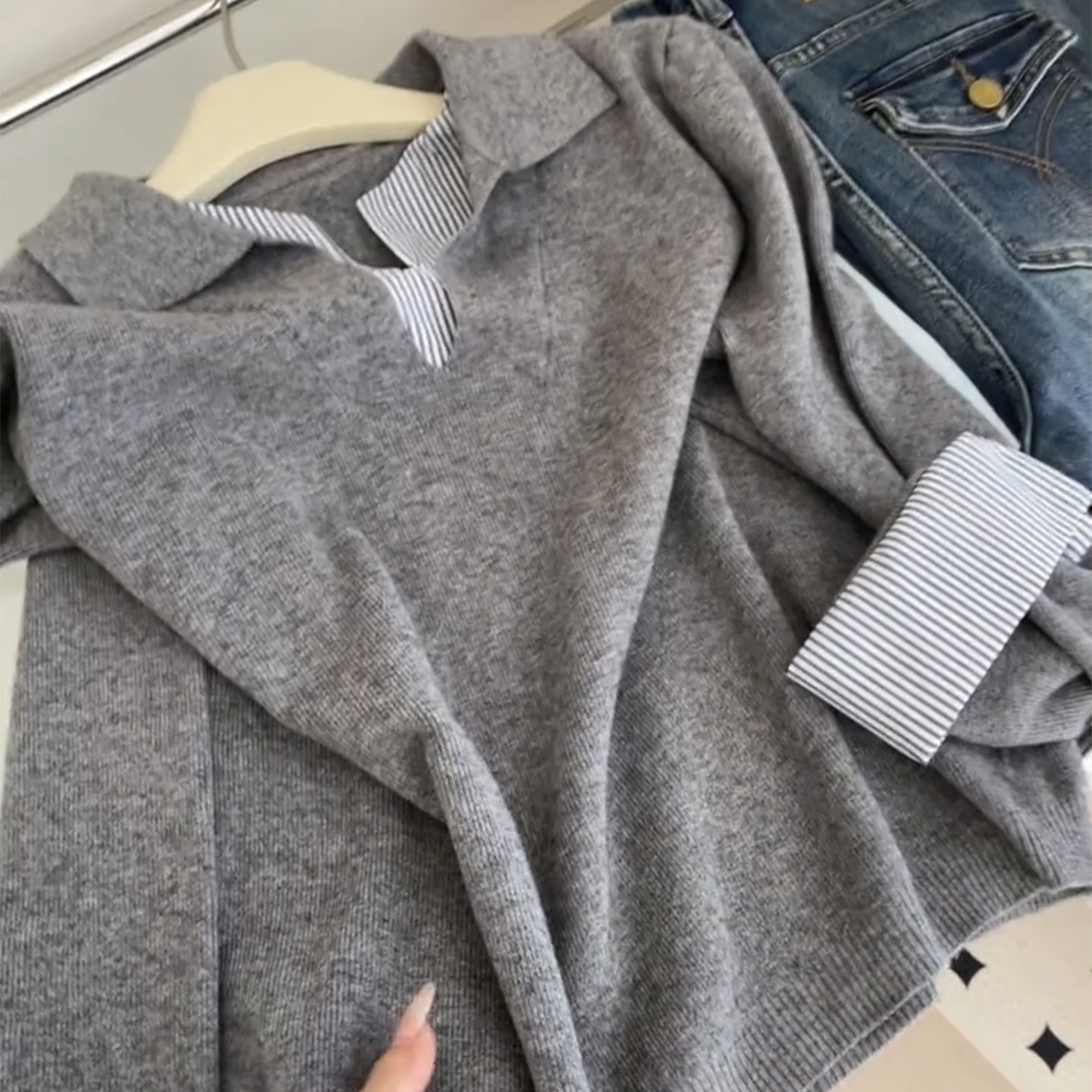 今年流行翻领条纹拼接假两件针织衫女宽松显瘦休闲百搭保暖毛衣