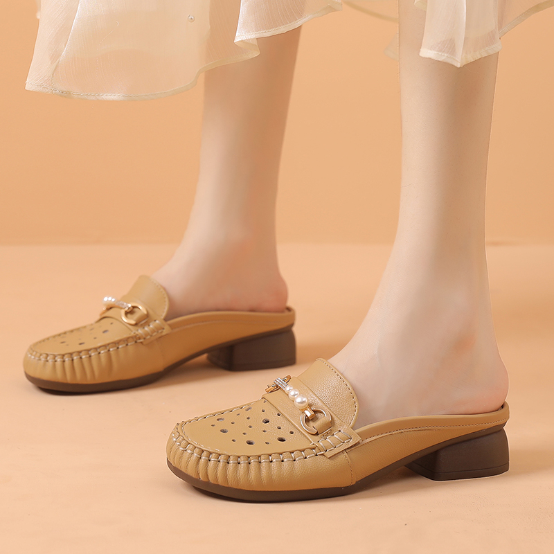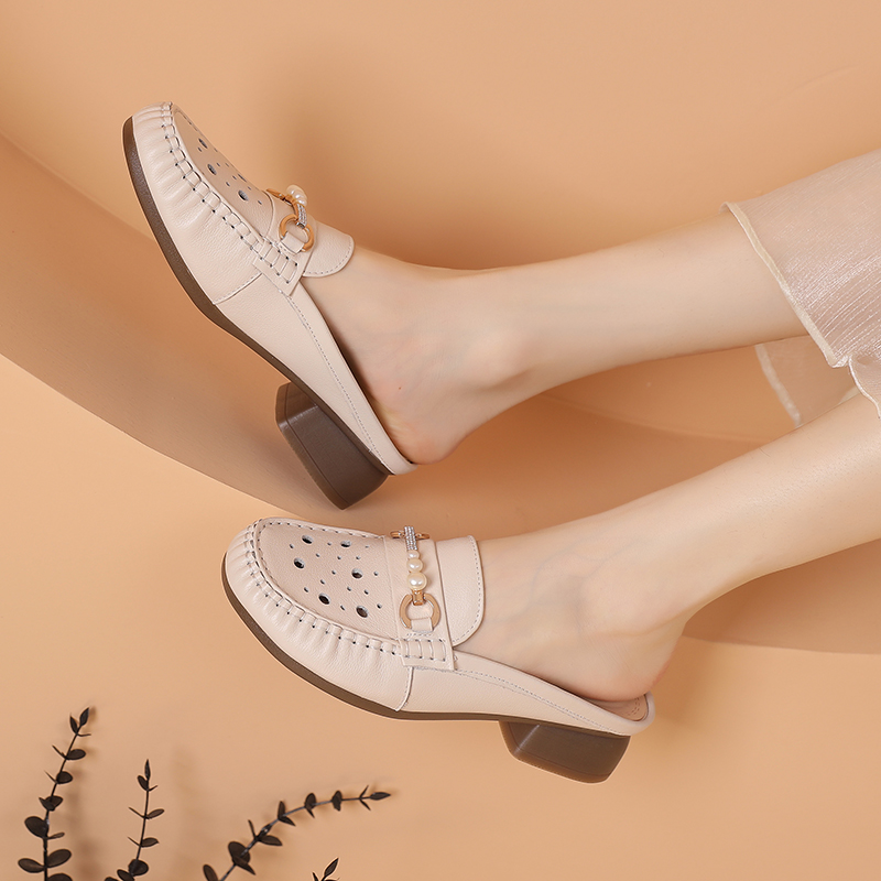全牛皮凉拖鞋夏季镂空大码女鞋41-43舒适百搭妈妈鞋真皮中跟半拖