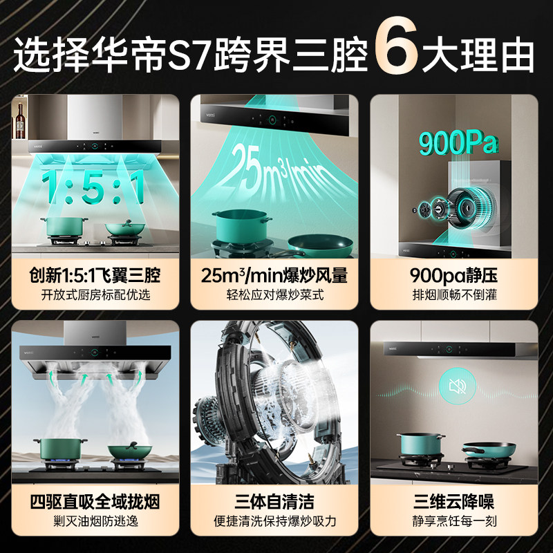 华帝S7三腔抽油烟机家用厨房大吸力变频自清洁欧式顶吸官方旗舰店