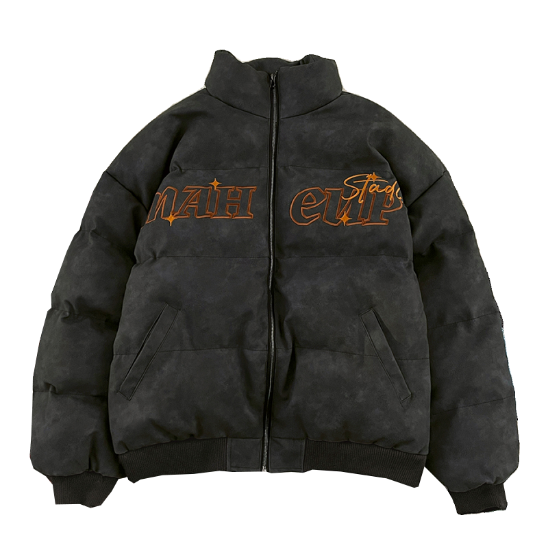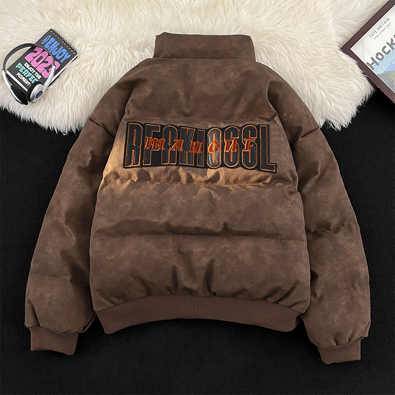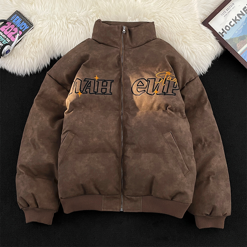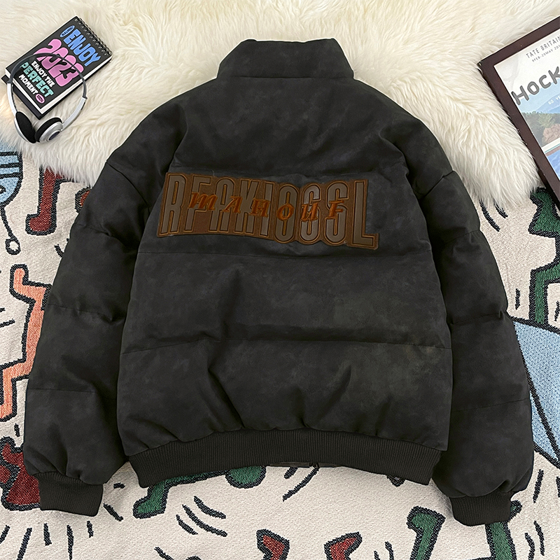 复古刺绣PU皮羽绒服棉服男女冬季加厚oversize宽松皮衣外套ins潮