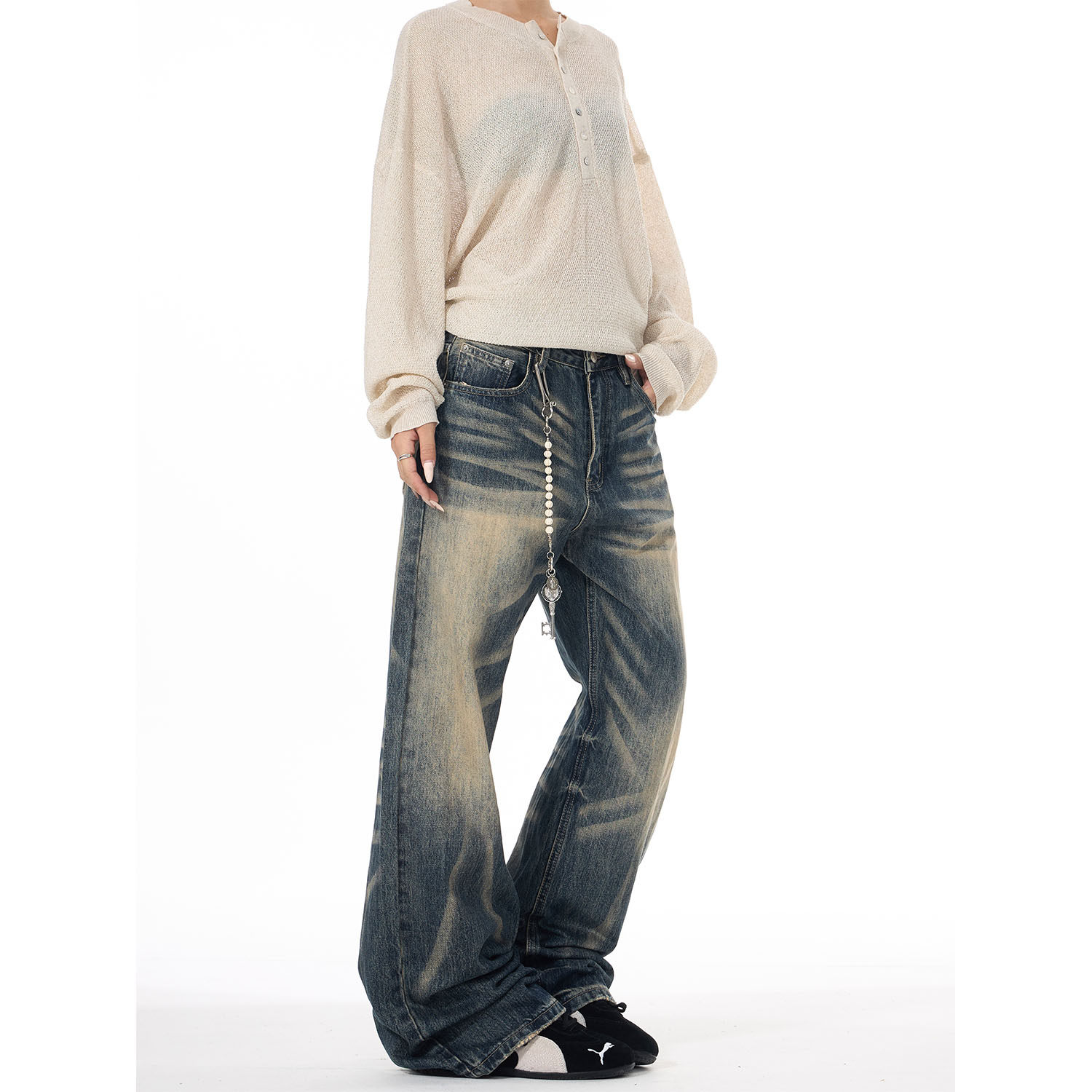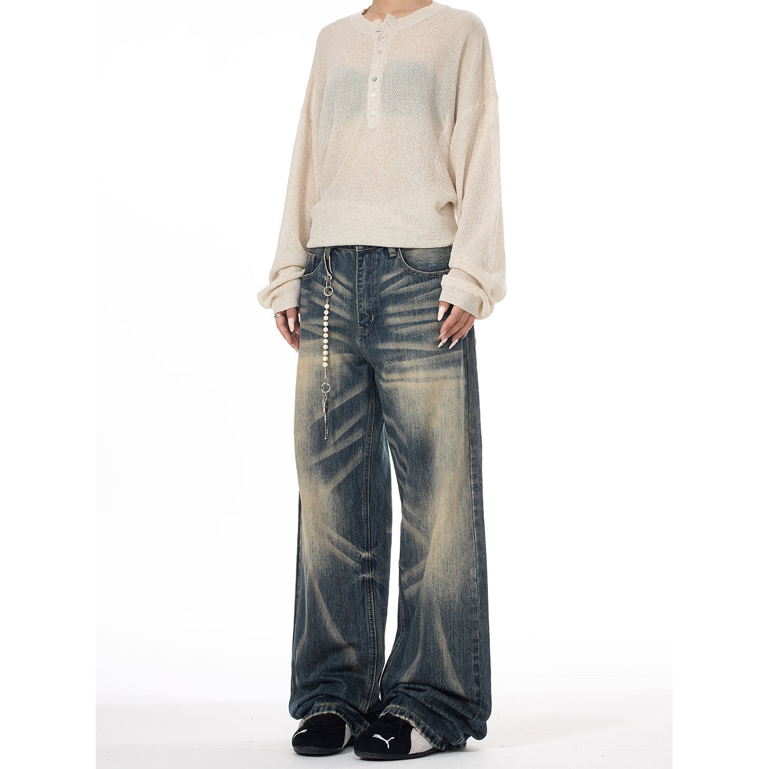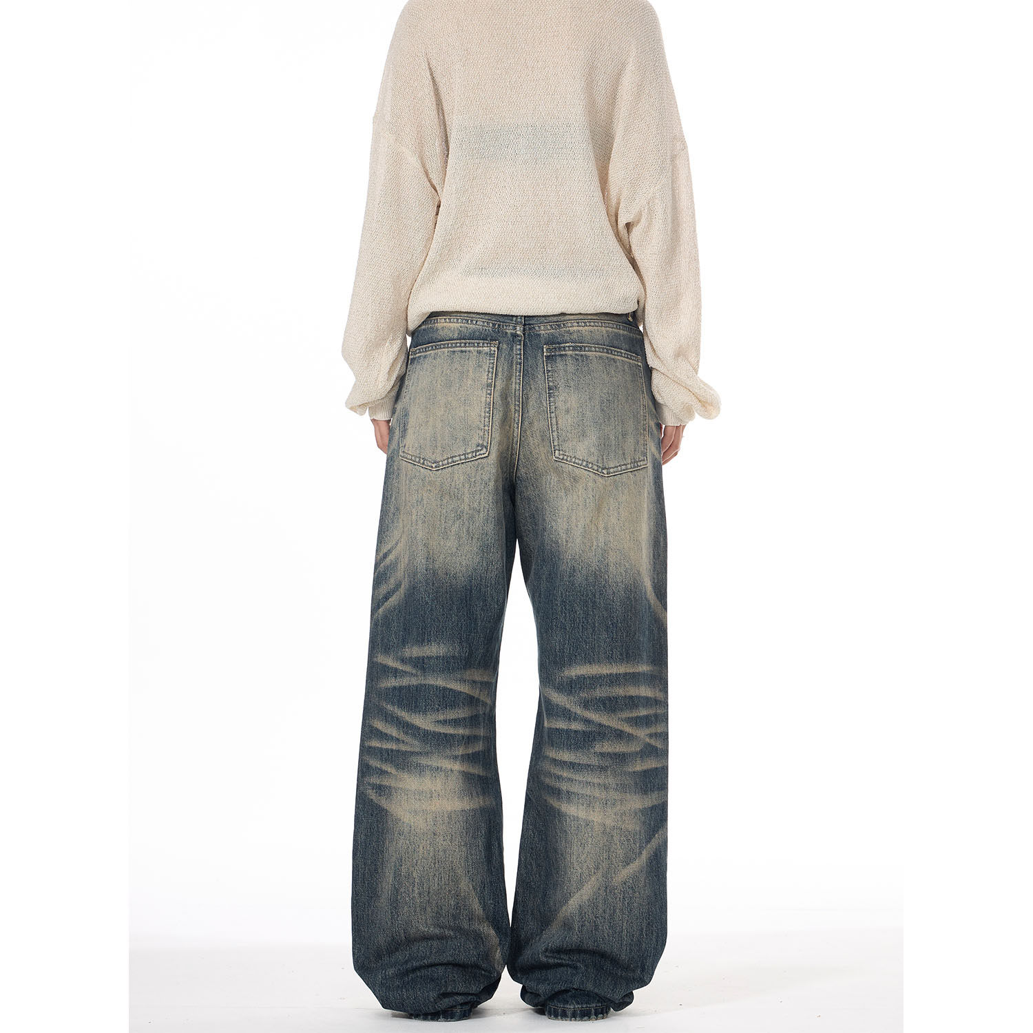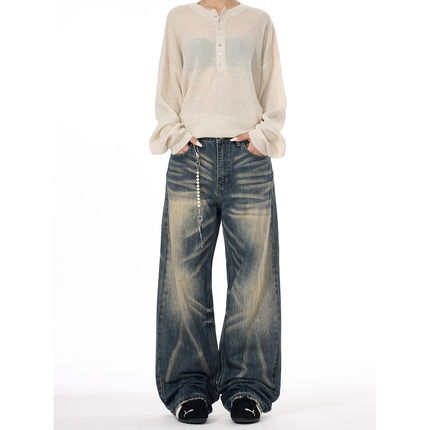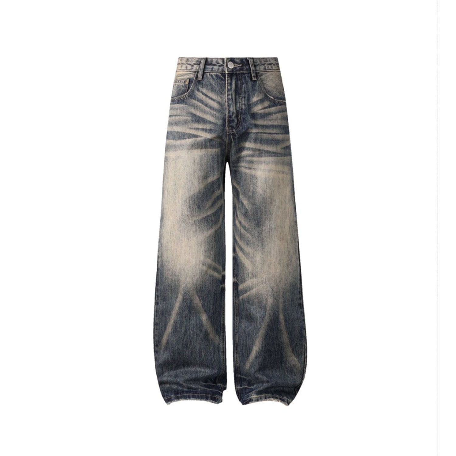 ISTURE美式复古水洗猫须渐变牛仔裤男女设计感休闲痞帅直筒长裤潮
