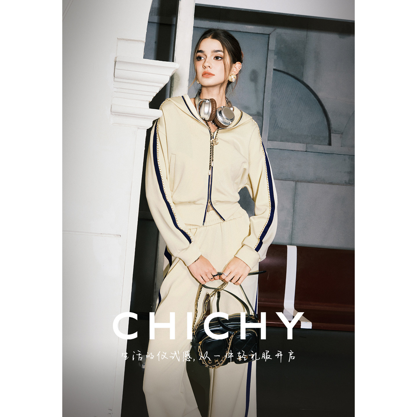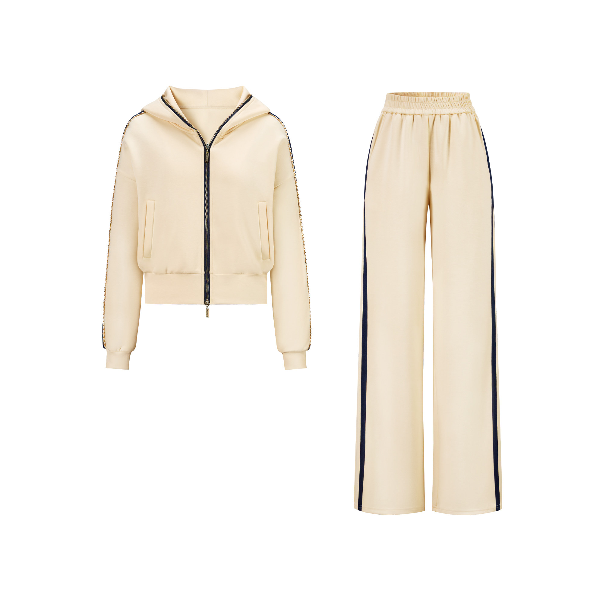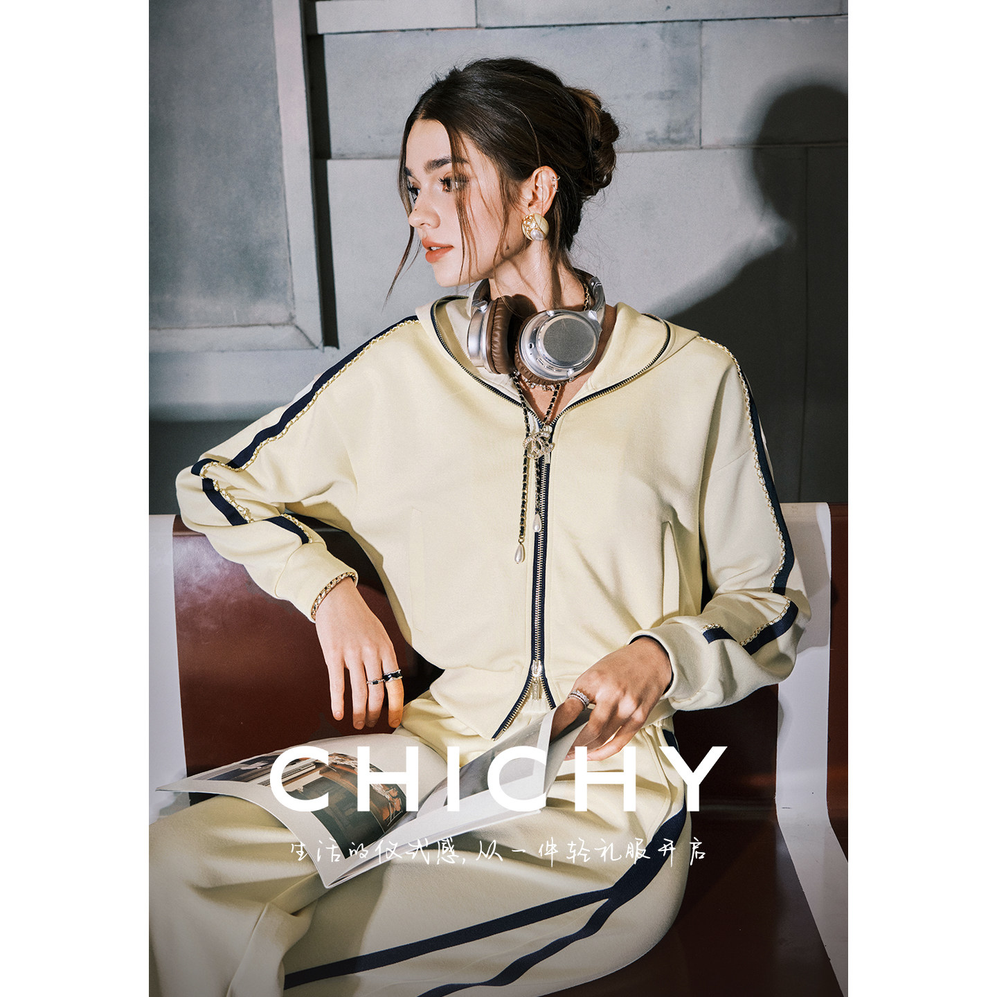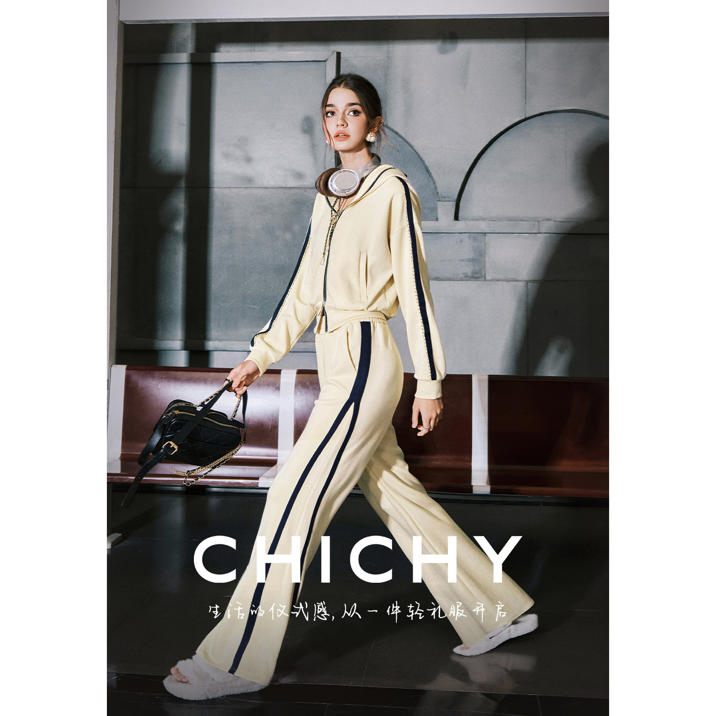 CHICHY千金风洋气修身运动套装女春季款黄色连帽外套休闲裤两件套