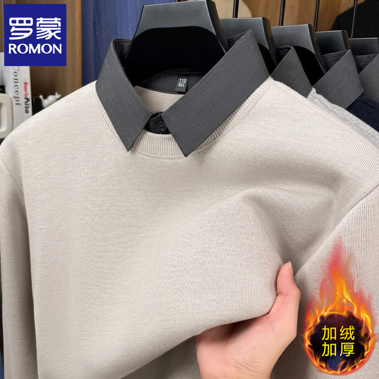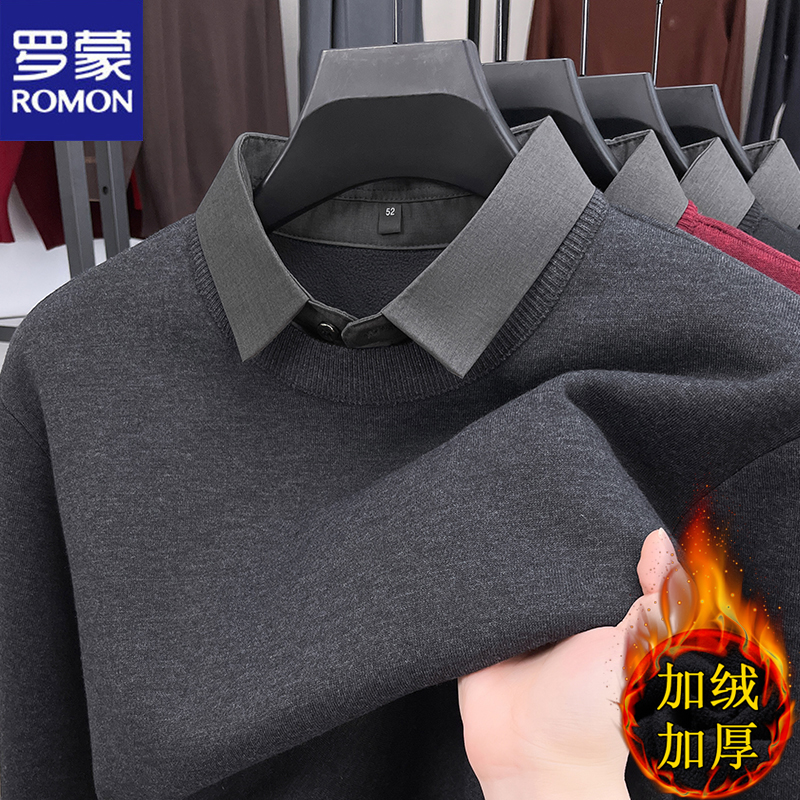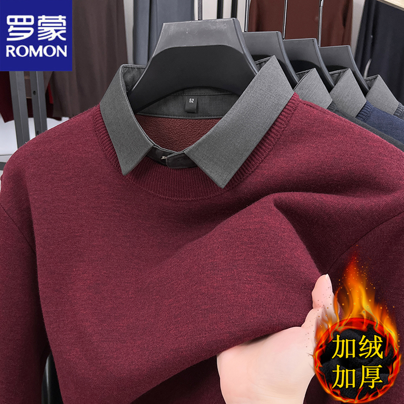 含羊毛罗蒙冬季新款假两件毛衣男士加绒加厚衬衫领加厚针织打底衫