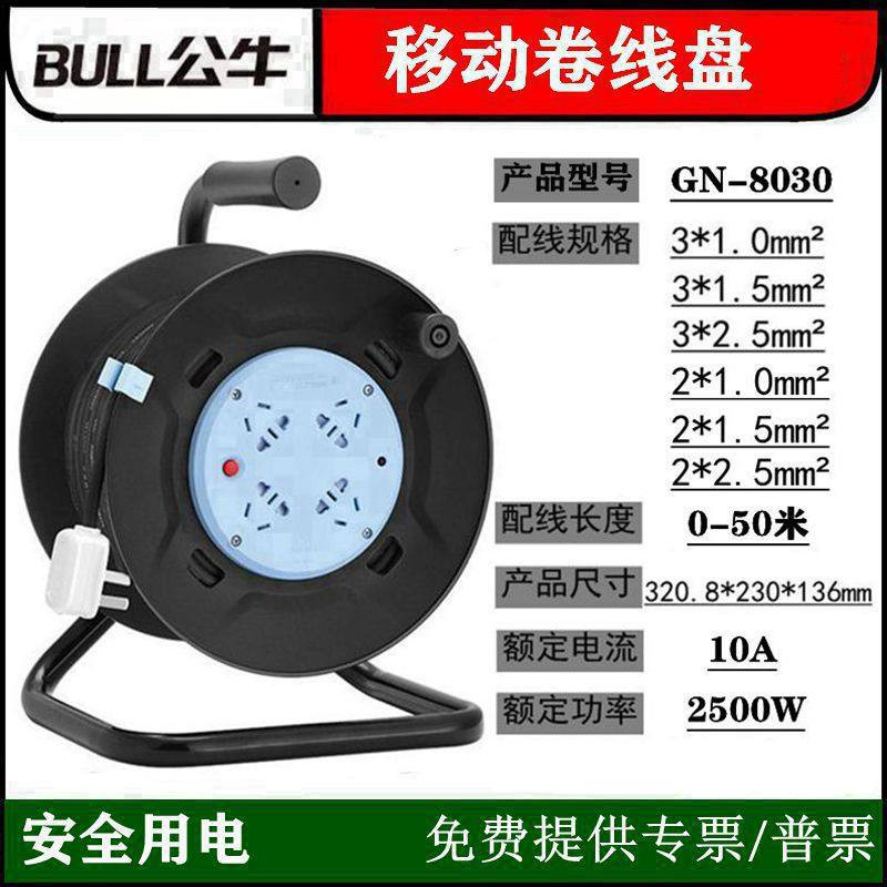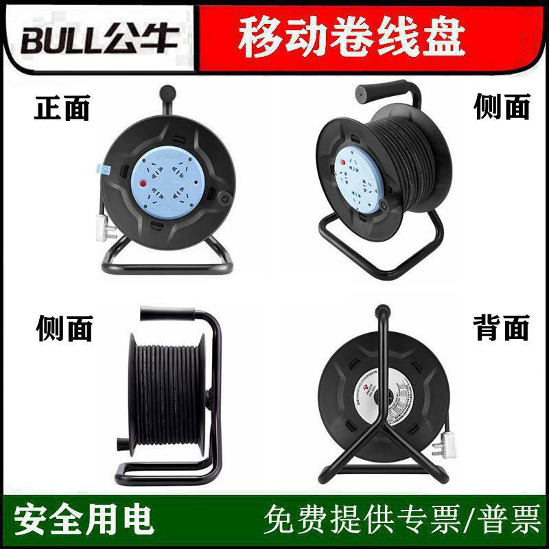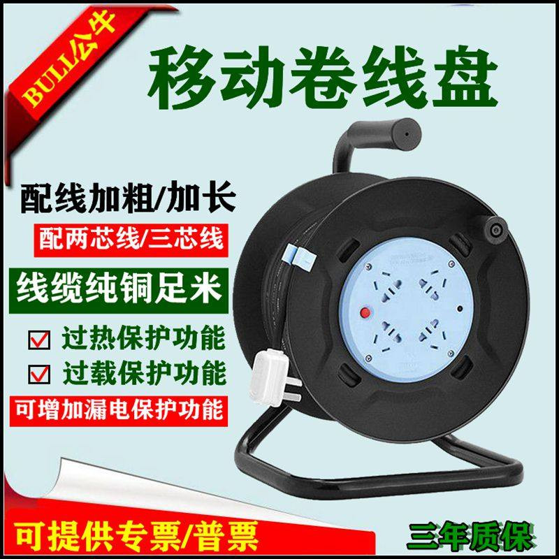 公牛线盘带线移动电缆线卷线器滚绕线盘收线轴工程拖线盘插座50米
