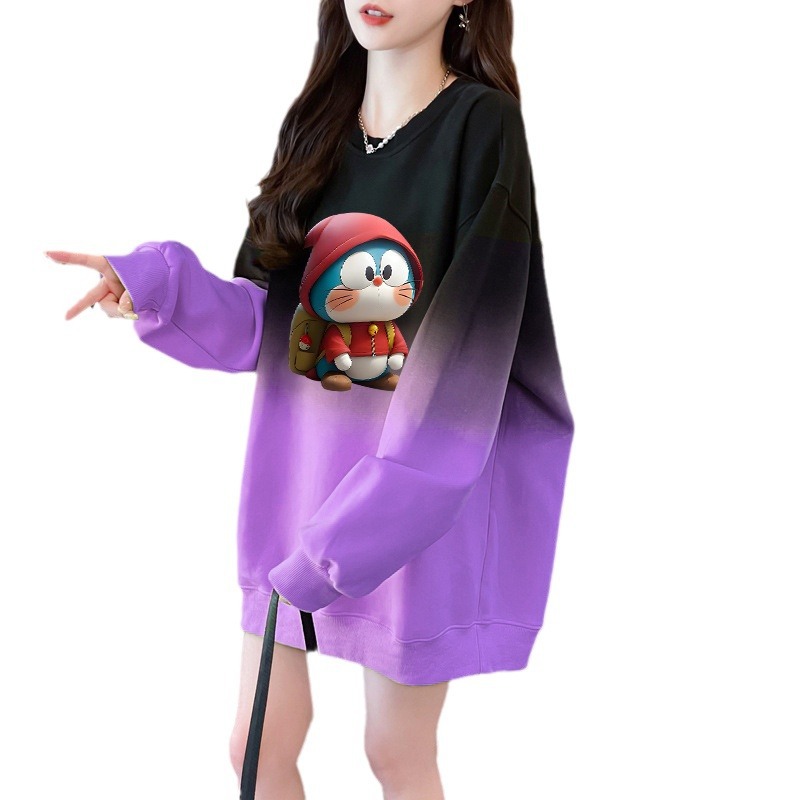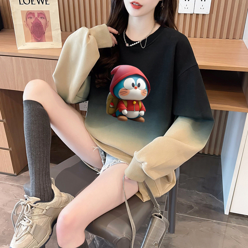 时尚卡通减龄中长款圆领卫衣女今年流行的撞色晕染宽松遮屁股