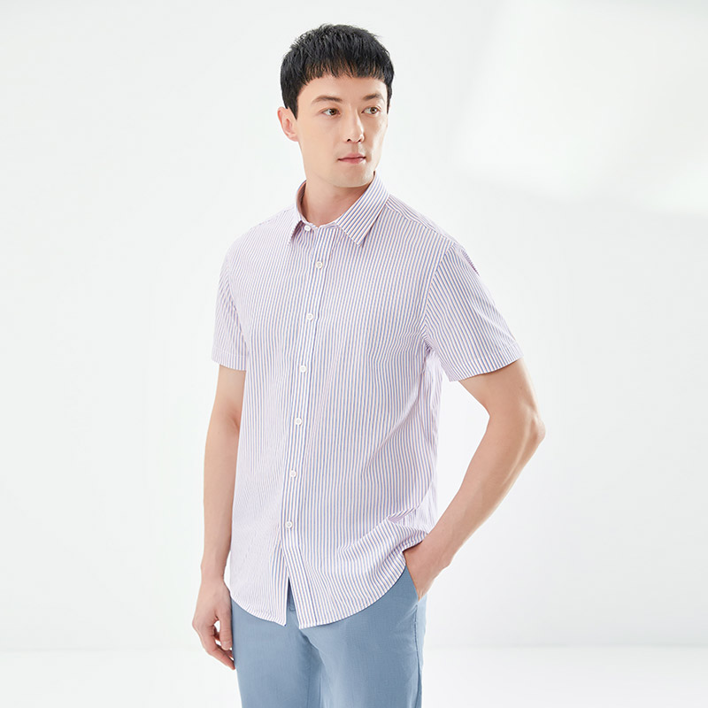 乔治白夏季男士短袖衬衫休闲撞色尖领条纹半袖涤纶混纺修身上衣潮
