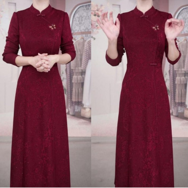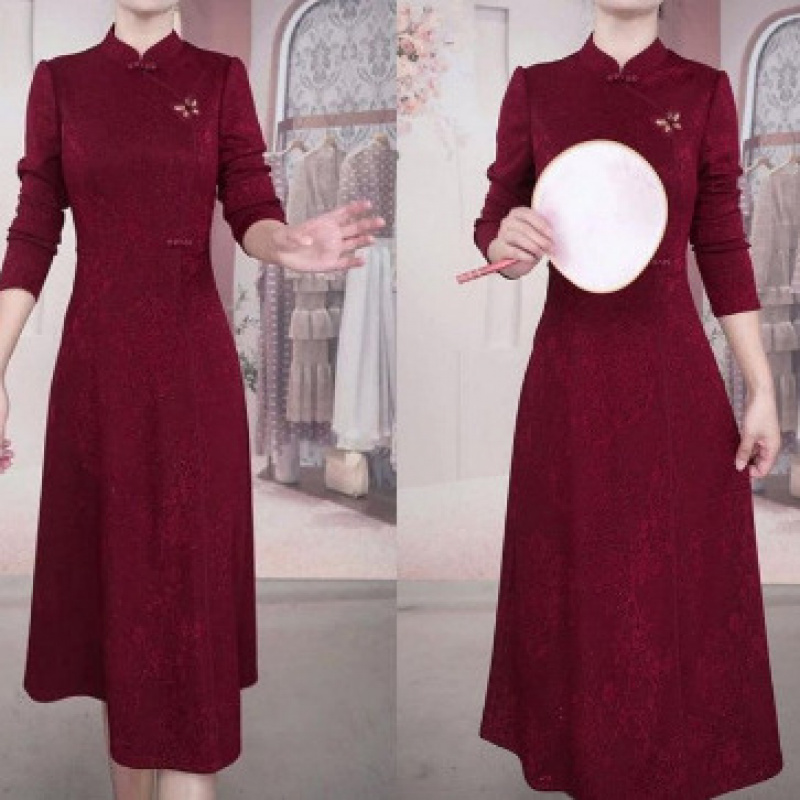 2025新款长袖改良旗袍连衣裙女2025秋冬新款妈妈礼服裙子