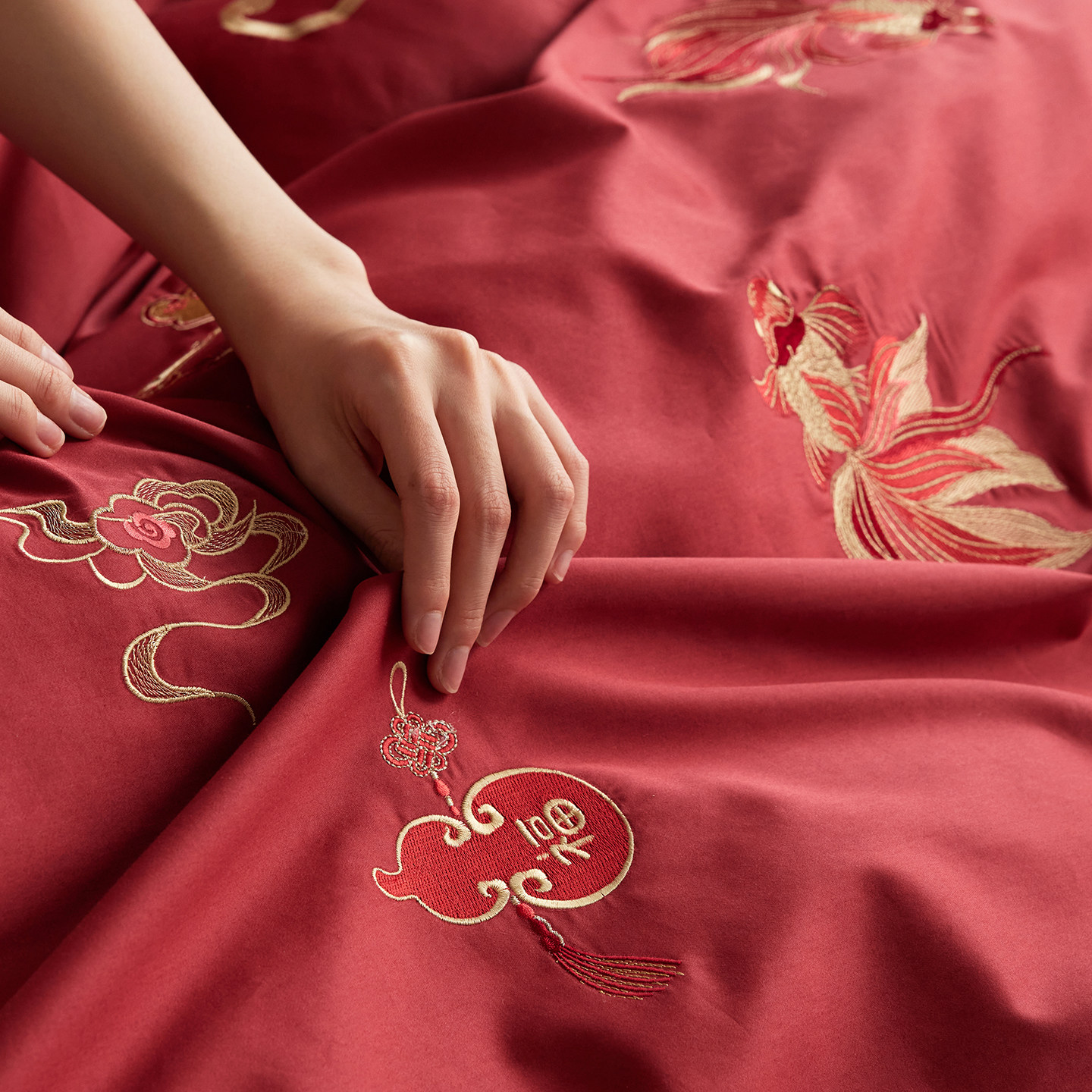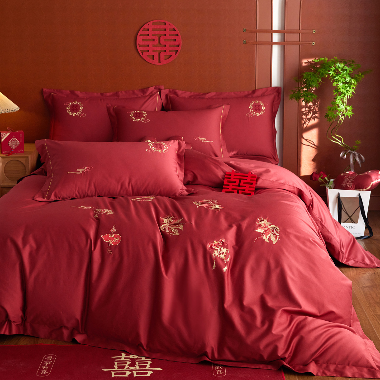 中式A类100S长绒棉四件套结婚刺绣被套床笠纯棉床单红色婚庆床品
