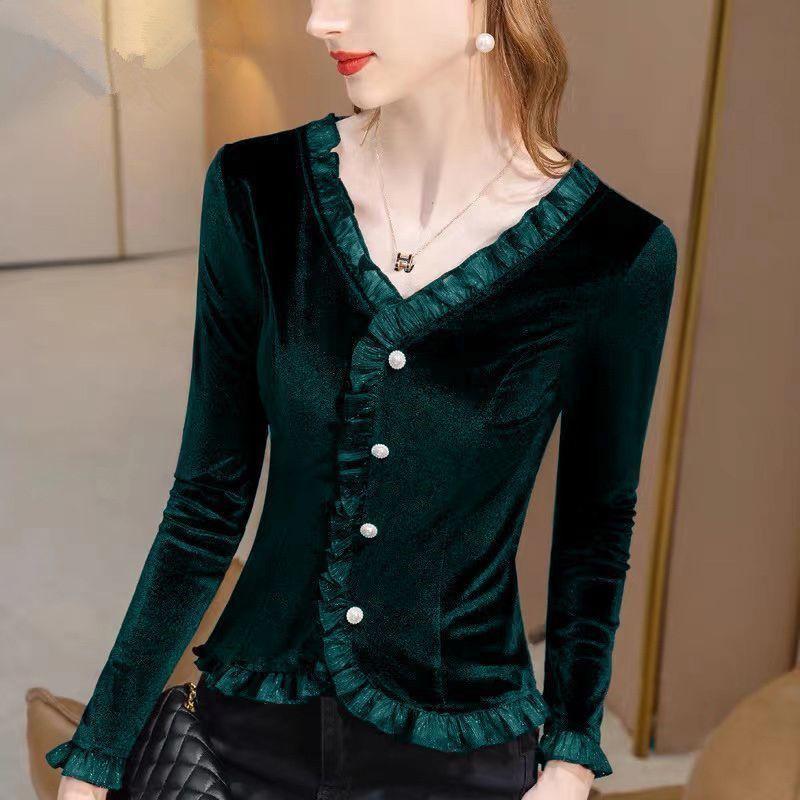 2025秋季新款女士修身显瘦小衫气质洋气衬衫黑色金丝绒高级感上衣