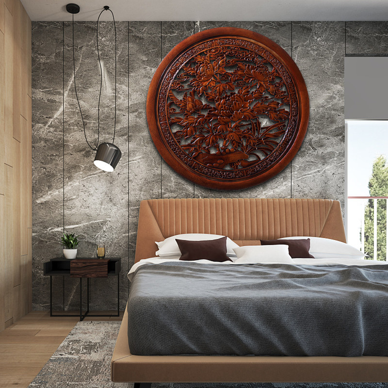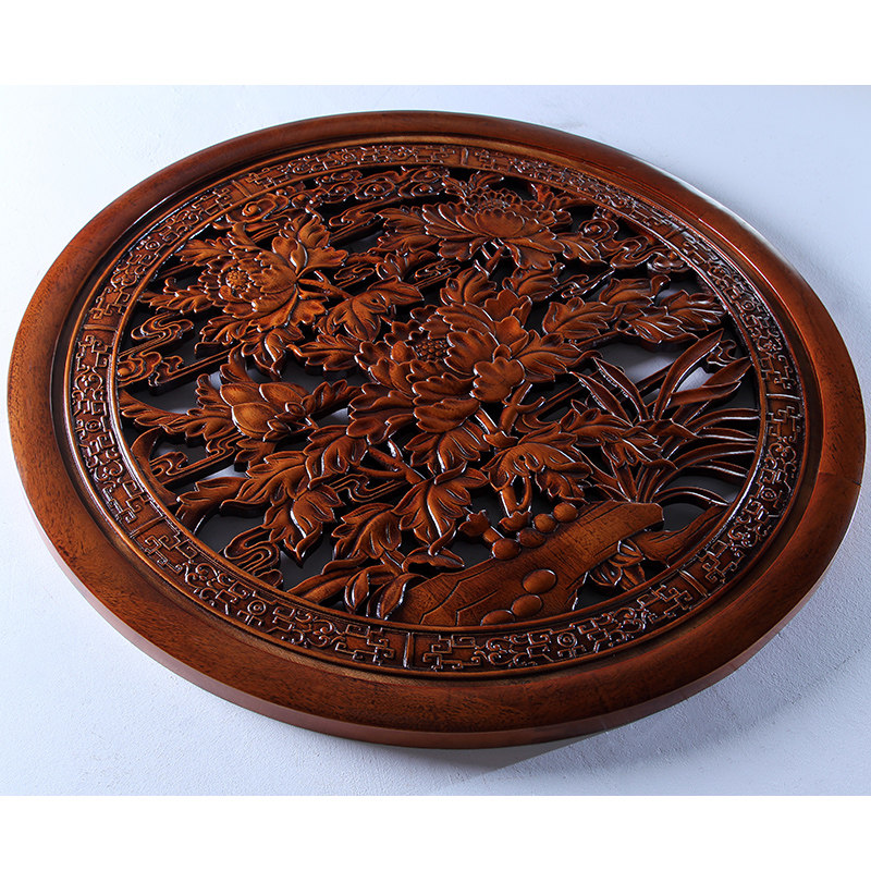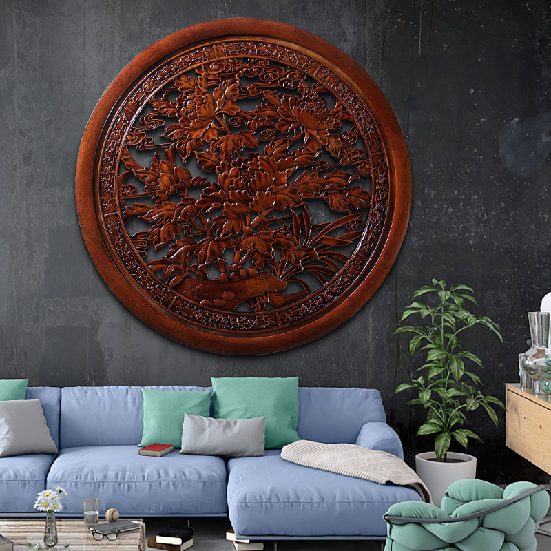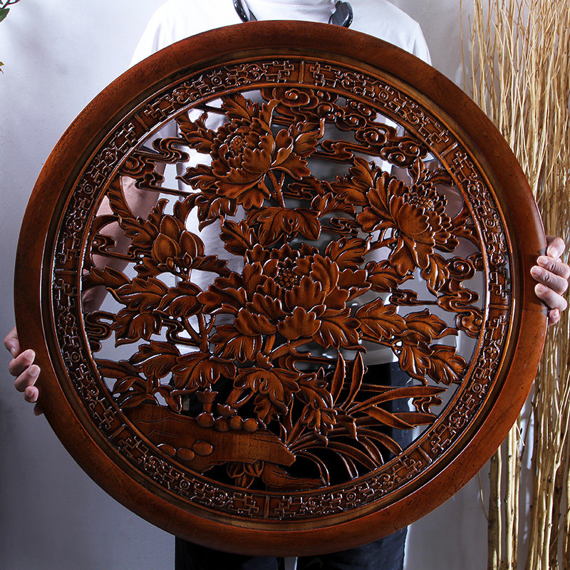 东阳木雕挂件香樟木头雕刻画工艺品中式客厅艺术室内圆形装饰牡丹