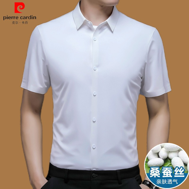 皮尔卡丹桑蚕丝衬衫男士短袖夏季新款休闲冰丝免烫衬衣爸爸装薄款