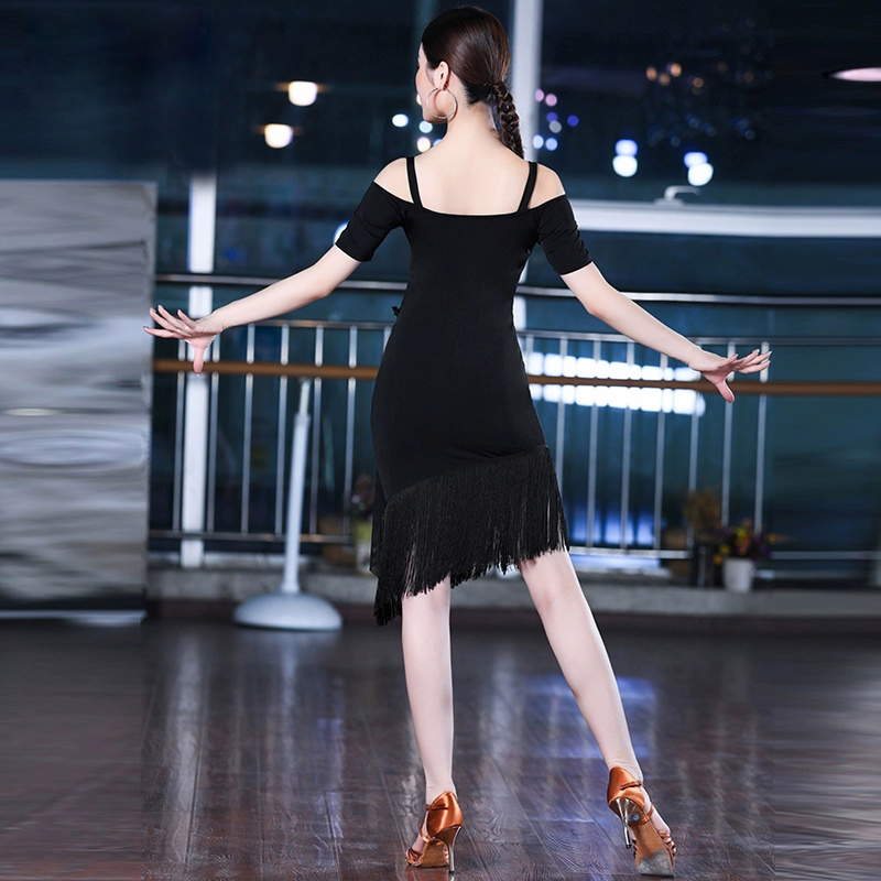 拉丁舞服练功女舞服成人黑色露肩流苏连衣裙新款国标舞演出比赛服