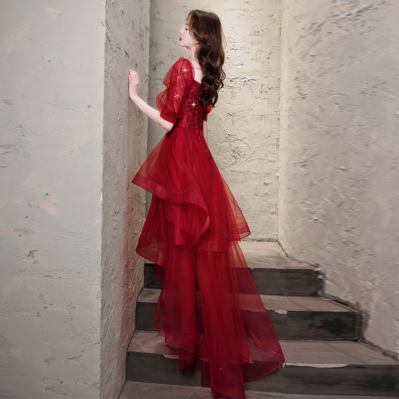 敬酒服新娘2026新款冬季酒红色婚纱泡泡袖一字肩在逃公主裙晚礼服