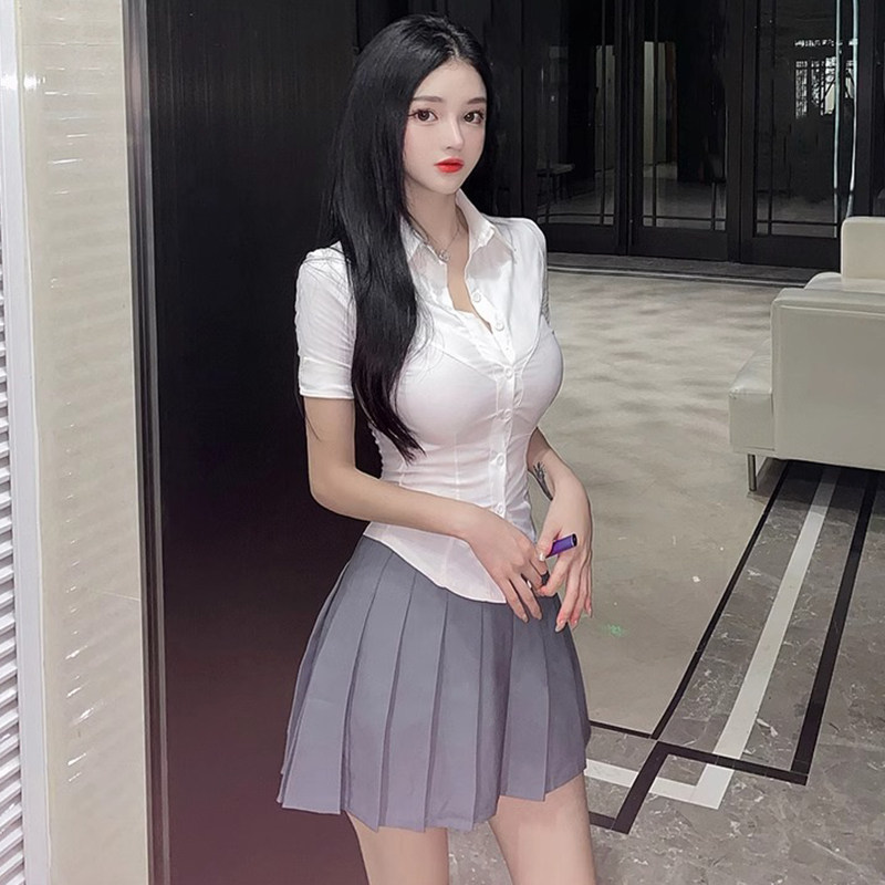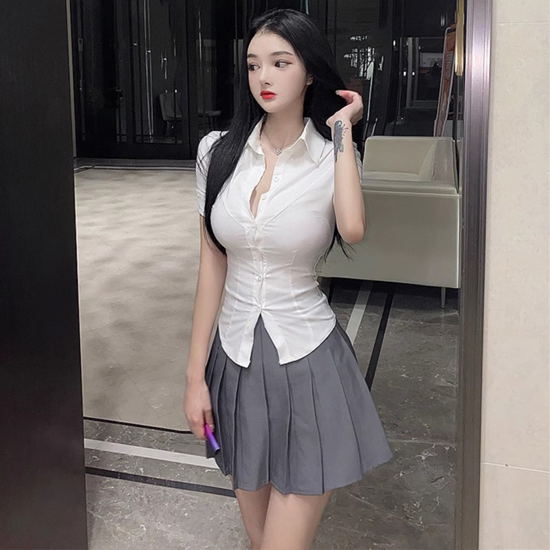 性感Polo领修身白色衬衫女夏季